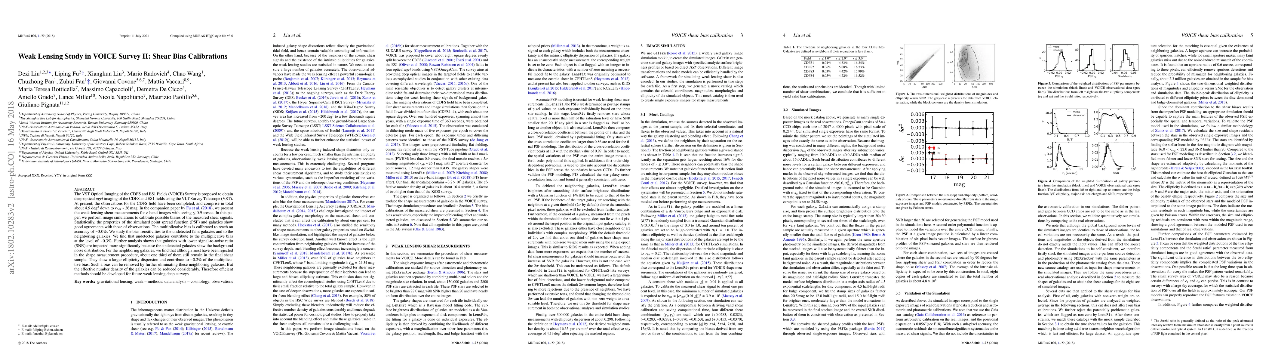 The VST Optical Imaging of the CDFS and ES1 Fields (VOICE) Survey is proposed to obtain deep optical $ugri$ imaging of the CDFS and ES1 fields using the VLT Survey Telescope (VST). At present, the observations for the CDFS field have been completed, and comprise in total about 4.9 deg$^2$ down to $r_\mathrm{AB}$$\sim$26 mag. In the companion paper by Fu et al. (2018), we present the weak lensing shear measurements for $r$-band images with seeing $\le$ 0.9 arcsec. In this paper, we perform image simulations to calibrate possible biases of the measured shear signals. Statistically, the properties of the simulated point spread function (PSF) and galaxies show good agreements with those of observations. The multiplicative bias is calibrated to reach an accuracy of $\sim$3.0%. We study the bias sensitivities to the undetected faint galaxies and to the neighboring galaxies. We find that undetected galaxies contribute to the multiplicative bias at the level of $\sim$0.3%. Further analysis shows that galaxies with lower signal-to-noise ratio (SNR) are impacted more significantly because the undetected galaxies skew the background noise distribution. For the neighboring galaxies, we find that although most have been rejected in the shape measurement procedure, about one third of them still remain in the final shear sample. They show a larger ellipticity dispersion and contribute to $\sim$0.2% of the multiplicative bias. Such a bias can be removed by further eliminating these neighboring galaxies. But the effective number density of the galaxies can be reduced considerably. Therefore efficient methods should be developed for future weak lensing deep surveys.