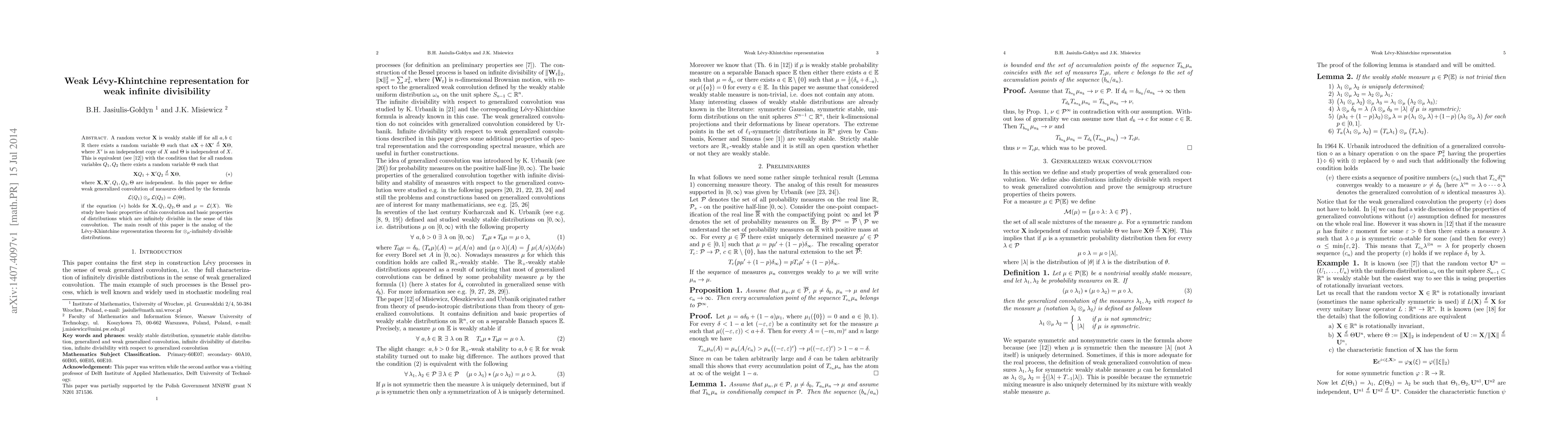 A random vector ${\bf X}$ is weakly stable iff for all $a,b \in \mathbb{R}$ there exists a random variable $\Theta$ such that $a{\bf X} + b {\bf X}' \stackrel{d}{=} {\bf X} \Theta$, where $X'$ is an independent copy of $X$ and $\Theta$ is independent of $X$. This is equivalent (see [12]) with the condition that for all random variables $Q_1, Q_2$ there exists a random variable $\Theta$ such that $$ {\bf X} Q_1 + {\bf X}' Q_2 \stackrel{d}{=} {\bf X} \Theta, \quad \quad \quad \quad \quad (\ast) $$ where ${\bf X}, {\bf X}', Q_1, Q_2, \Theta$ are independent. In this paper we define weak generalized convolution of measures defined by the formula $$ {\mathcal L}(Q_1) \otimes_{\mu} {\mathcal L}(Q_2) = {\mathcal L}(\Theta), $$ if the equation $(\ast)$ holds for ${\bf X}, Q_1, Q_2, \Theta$ and $\mu = {\mathcal L}(X)$. We study here basic properties of this convolution and basic properties of distributions which are infinitely divisible in the sense of this convolution. The main result of this paper is the analog of the L\'evy-Khintchine representation theorem for $\otimes_{\mu}$-infinitely divisible distributions.