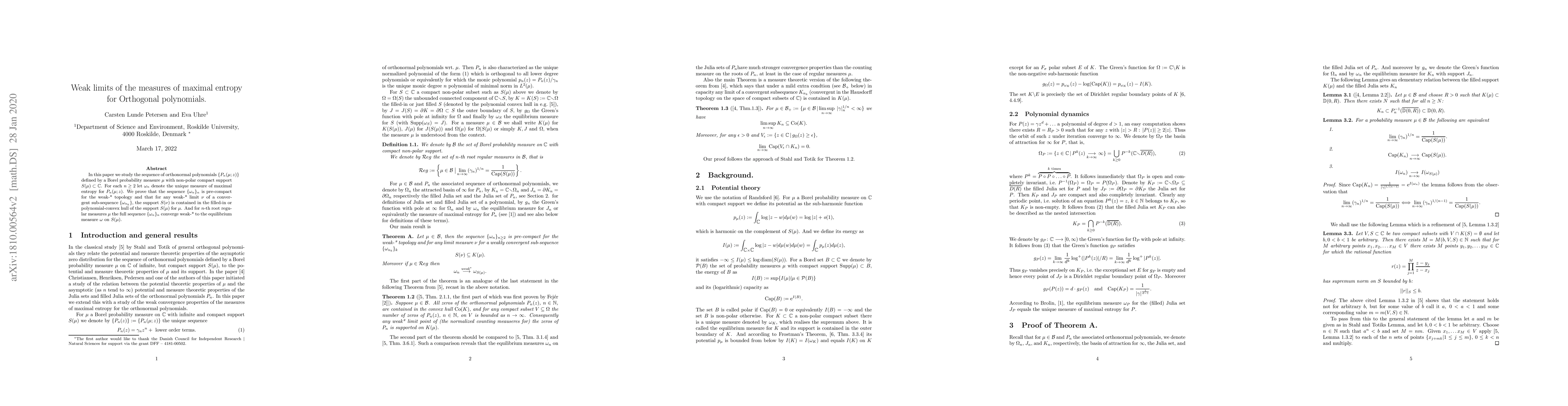In this paper we study the sequence of orthonormal polynomials $\{P_n(\mu; z)\}$ defined by a probability measure $\mu$ with non-polar compact support $S(\mu)\subset\mathbb C$. We show that the support of any weak* limit of the sequence of measures of maximal entropy $\omega_n$ for $P_n$ is contained in the polynomial-convex hull of $S(\mu)$. And for $n$-th root regular measures the $\omega_n$ converge weak* to the equilibrium measure on $S(\mu)$.