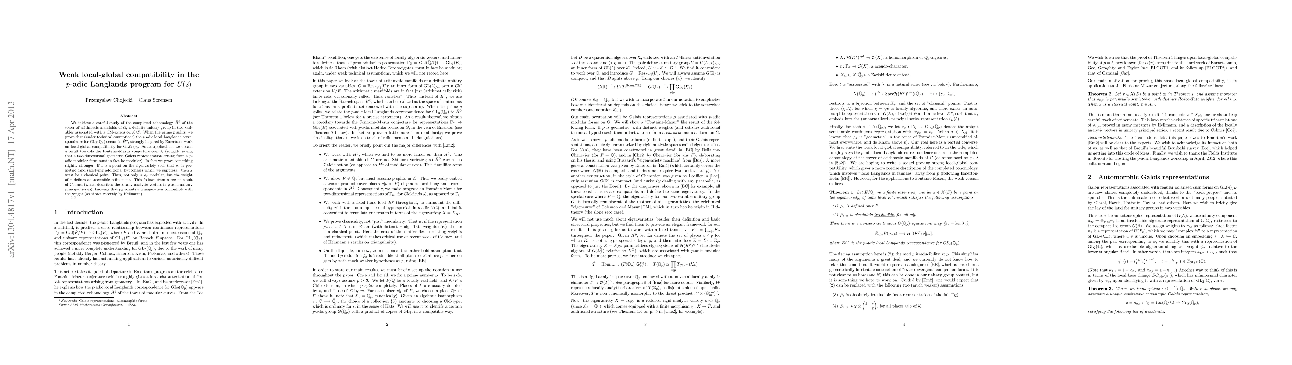 This paper investigates the weak local-global compatibility in the p-adic Langlands program for U(2), demonstrating that the p-adic local Langlands correspondence for GL(2) appears in the cohomology under specific conditions when p splits. An application to the Fontaine-Mazur conjecture over CM fields is also provided.