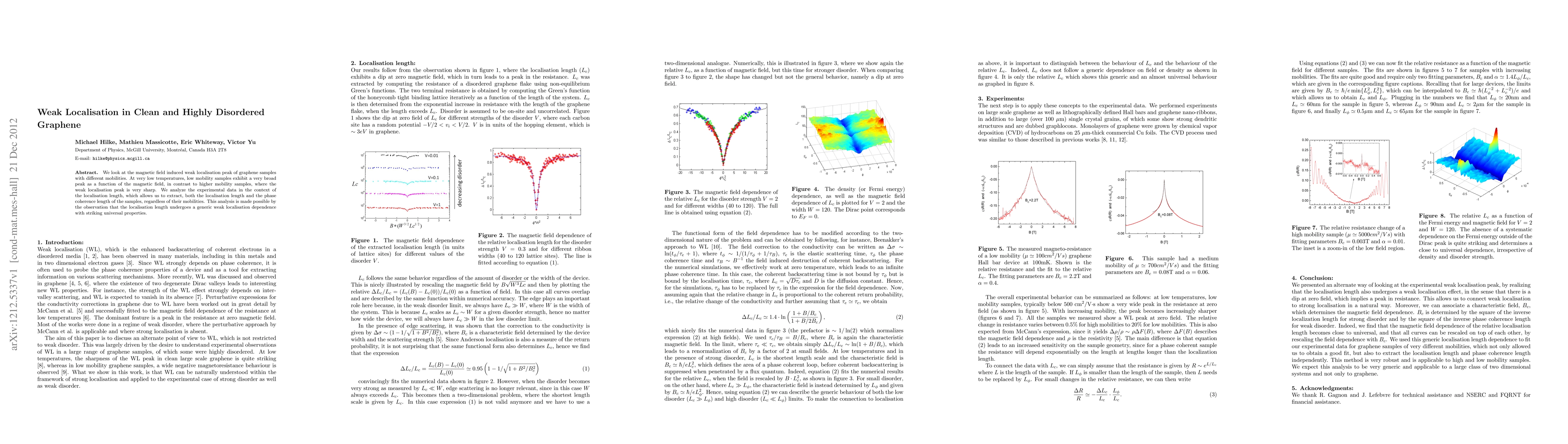 This paper investigates the magnetic field induced weak localisation peak in graphene samples with varying mobilities, finding that low mobility samples show broad peaks while high mobility samples exhibit sharp peaks. The analysis reveals universal properties of the localisation length and phase coherence length, independent of mobility.
