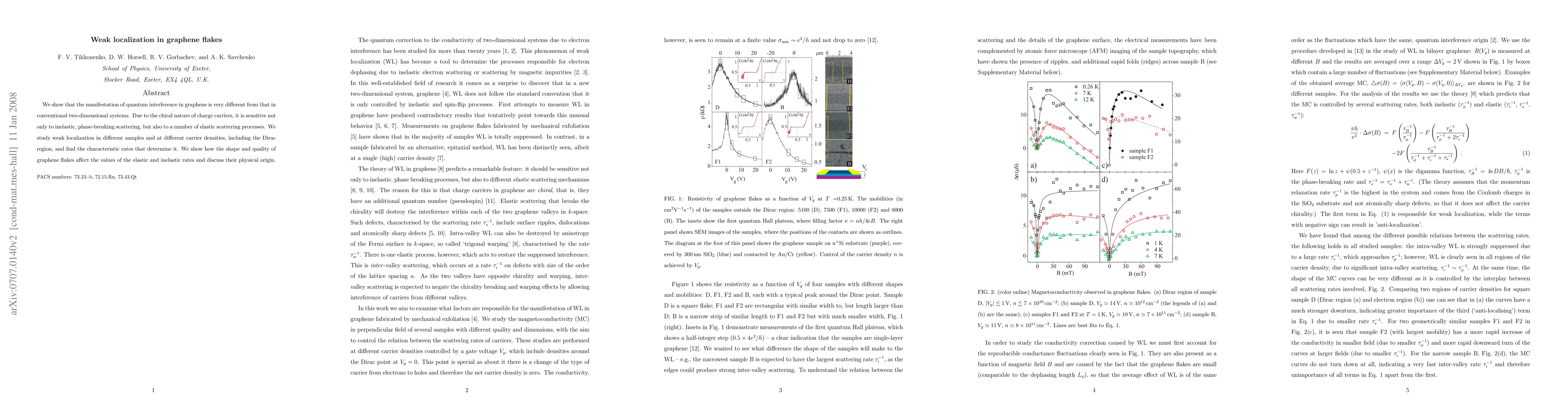 This paper investigates quantum interference in graphene, revealing that weak localization is influenced by both elastic and inelastic scattering due to the chiral nature of charge carriers. The study finds that the shape and quality of graphene flakes significantly affect the rates of these scattering processes.