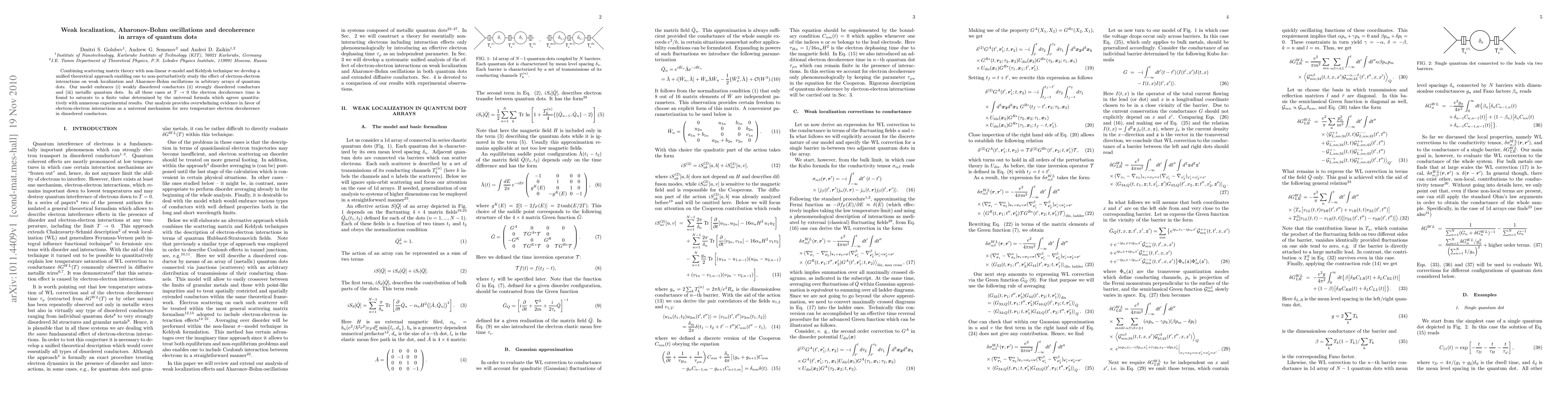 This paper develops a unified theoretical framework to study electron-electron interactions' impact on weak localization and Aharonov-Bohm oscillations in quantum dot arrays. The model predicts a finite decoherence time at $T \to 0$, agreeing with experimental data, and supports electron-electron interactions as a universal mechanism for electron decoherence in disordered conductors.