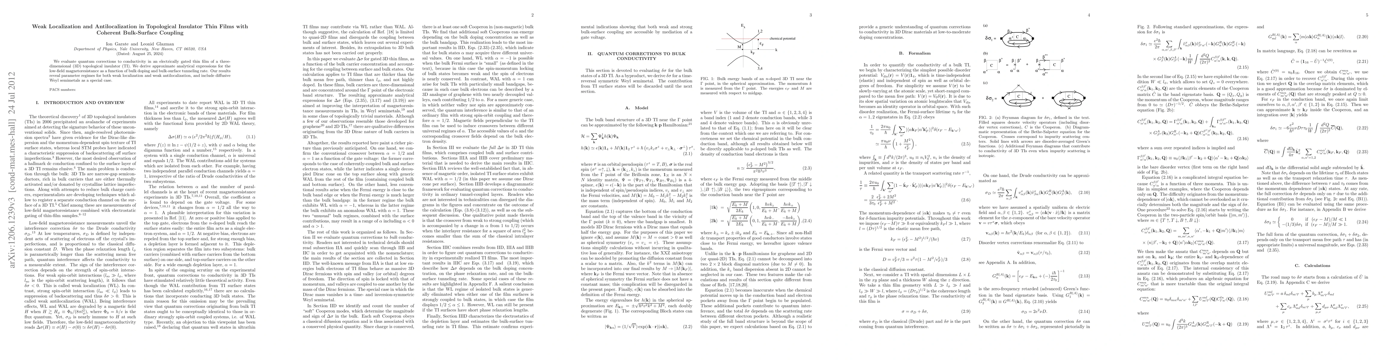 We evaluate quantum corrections to conductivity in an electrically gated thin film of a three-dimensional (3D) topological insulator (TI). We derive approximate analytical expressions for the low-field magnetoresistance as a function of bulk doping and bulk-surface tunneling rate. Our results reveal parameter regimes for both weak localization and weak antilocalization, and include diffusive Weyl semimetals as a special case.