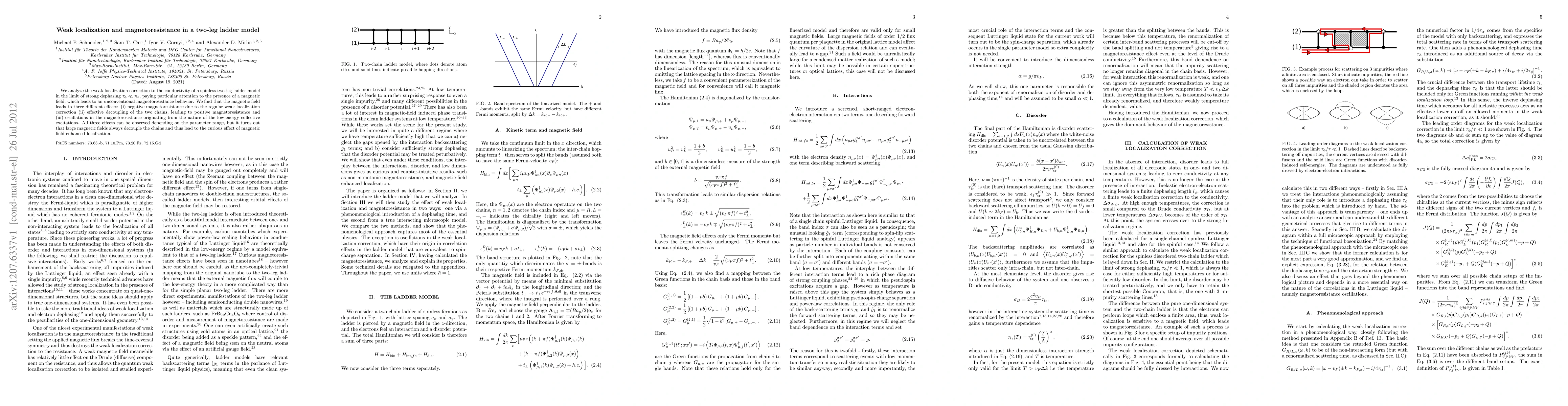 We analyze the weak localization correction to the conductivity of a spinless two-leg ladder model in the limit of strong dephasing \tau_\phi << \tau_tr, paying particular attention to the presence of a magnetic field, which leads to an unconventional magnetoresistance behavior. We find that the magnetic field leads to three different effects: (i) negative magnetoresistance due to the regular weak localization correction (ii) effective decoupling of the two chains, leading to positive magnetoresistance and (iii) oscillations in the magnetoresistance originating from the nature of the low-energy collective excitations. All three effects can be observed depending on the parameter range, but it turns out that large magnetic fields always decouple the chains and thus lead to the curious effect of magnetic field enhanced localization.