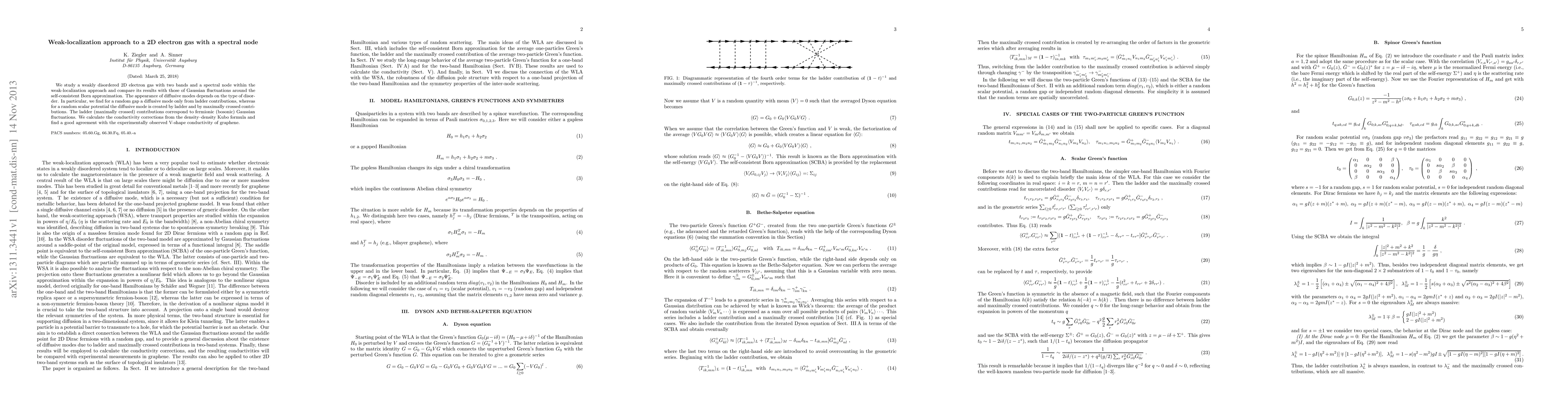 We study a weakly disordered 2D electron gas with two bands and a spectral node within the weak-localization approach and compare its results with those of Gaussian fluctuations around the self-consistent Born approximation. The appearance of diffusive modes depends on the type of disorder. In particular, we find for a random gap a diffusive mode only from ladder contributions, whereas for a random scalar potential the diffusive mode is created by ladder and by maximally crossed contributions. The ladder (maximally crossed) contributions correspond to fermionic (bosonic) Gaussian fluctuations. We calculate the conductivity corrections from the density--density Kubo formula and find a good agreement with the experimentally observed V-shape conductivity of graphene.