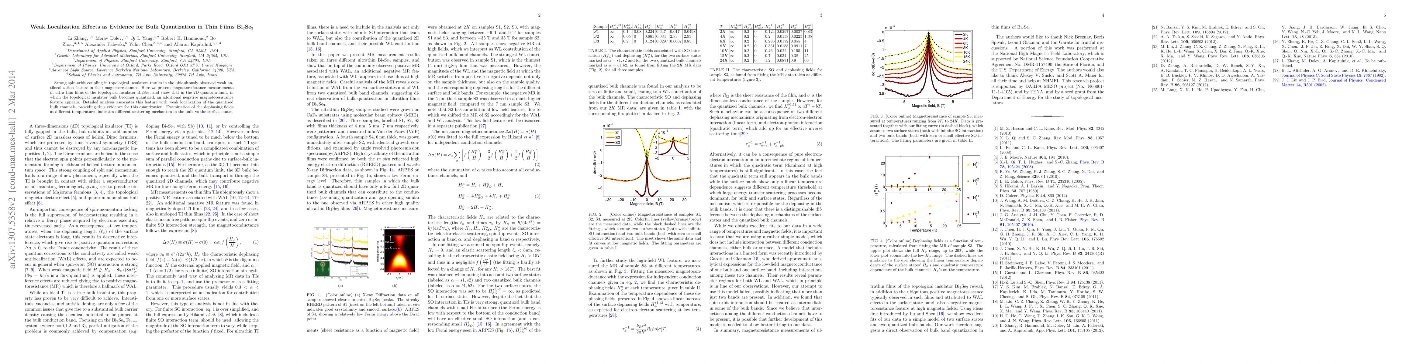 The paper investigates magnetoresistance in ultra-thin Bi_2Se_3 films, revealing weak localization effects in the 2D quantum limit indicative of bulk quantization. The observed negative magnetoresistance highlights different scattering mechanisms in bulk versus surface states.