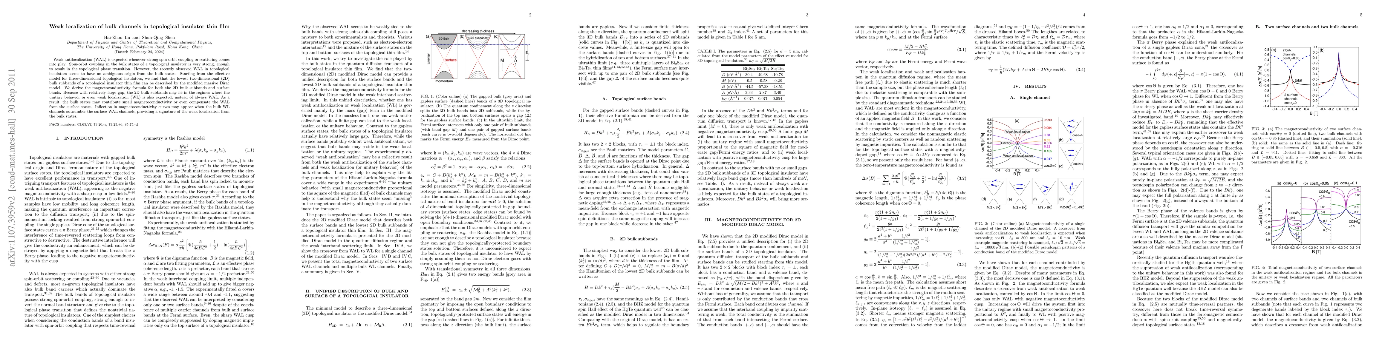 Weak antilocalization (WAL) is expected whenever strong spin-orbit coupling or scattering comes into play. Spin-orbit coupling in the bulk states of a topological insulator is very strong, enough to result in the topological phase transition. However, the recently observed WAL in topological insulators seems to have an ambiguous origin from the bulk states. Starting from the effective model for three-dimensional topological insulators, we find that the lowest two-dimensional (2D) bulk subbands of a topological insulator thin film can be described by the modified massive Dirac model. We derive the magnetoconductivity formula for both the 2D bulk subbands and surface bands. Because with Relatively large gap, the 2D bulk subbands may lie in the regimes where the unitary behavior or even weak localization (WL) is also expected, instead of always WAL. As a result, the bulk states may contribute small magnetoconductivity or even compensate the WAL from the surface states. Inflection in magnetoconductivity curves may appear when the bulk WL channels outnumber the surface WAL channels, providing a signature of the weak localization from the bulk states.