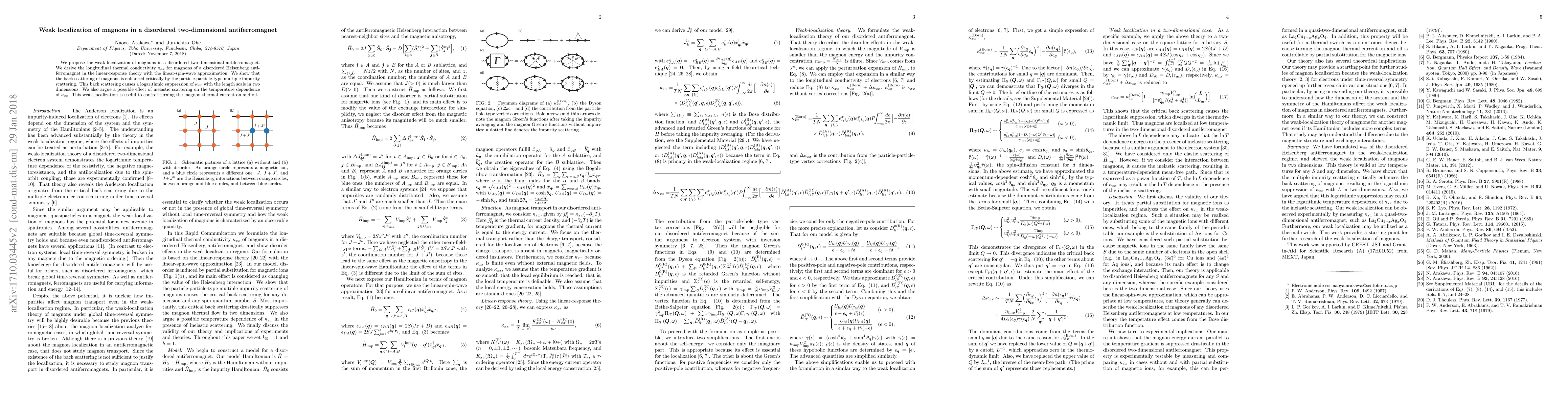 Two-line summary: This paper investigates the weak localization of magnons in disordered two-dimensional antiferromagnets, demonstrating enhanced back scattering due to multiple impurity scattering. It derives the longitudinal thermal conductivity $\kappa_{xx}$ and shows that it logarithmically decreases with length scale, suggesting a method to control magnon thermal current via this phenomenon.