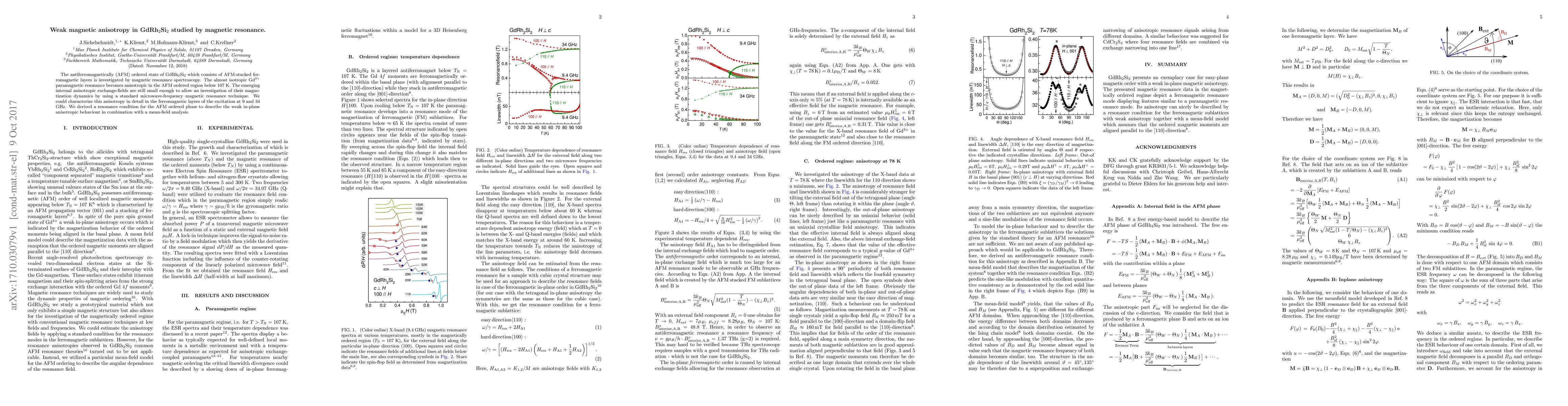 This study uses magnetic resonance spectroscopy to examine the weak magnetic anisotropy in the antiferromagnetically ordered GdRh$_2$Si$_2$. Below 107 K, the almost isotropic Gd$^{3+}$ resonance becomes anisotropic, enabling detailed investigation of magnetization dynamics in ferromagnetic layers using standard microwave-frequency techniques. The researchers derived a resonance condition for the AFM ordered phase to describe weak in-plane anisotropic behavior.