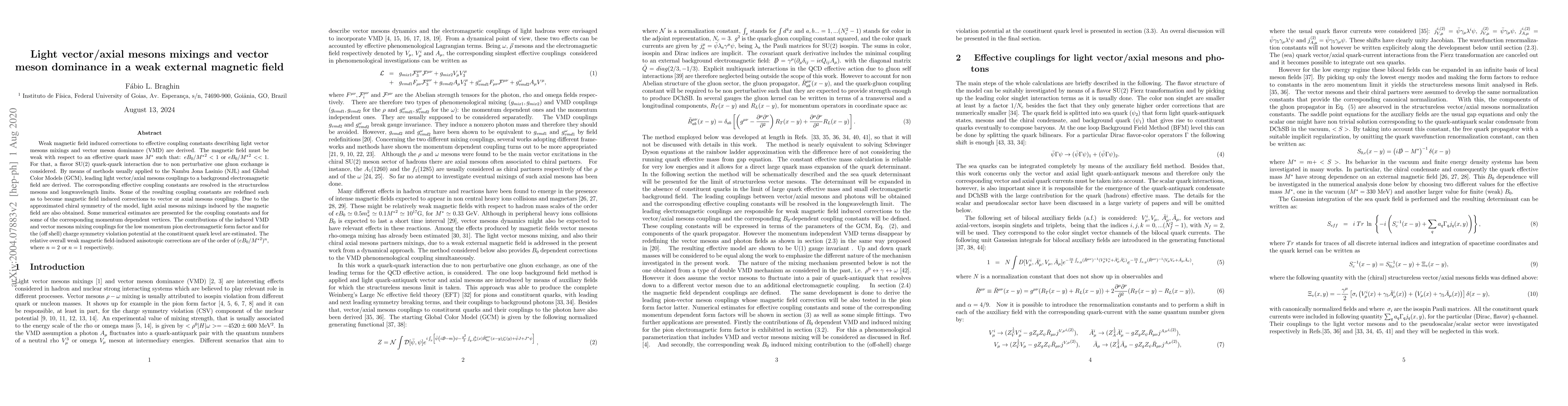 Weak magnetic field induced corrections to effective coupling constants describing light vector mesons mixings and vector meson dominance (VMD) are derived. The magnetic field must be weak with respect to an effective quark mass $M^*$ such that: $eB_0/{M^*}^2< 1$ or $eB_0/{M^*}^2<<1$.For that, a flavor SU(2) quark-quark interaction due to non perturbative one gluon exchange is considered. By means of methods usually applied to the Nambu Jona Lasinio (NJL) and Global Color Models (GCM), leading light vector/axial mesons couplings to a background electromagnetic field are derived. The corresponding effective coupling constants are resolved in the structureless mesons and longwavelength limits. Some of the resulting coupling constants are redefined such as to become magnetic field induced corrections to vector or axial mesons couplings. Due to the approximated chiral symmetry of the model, light axial mesons mixings induced by the magnetic field are also obtained. Some numerical estimates are presented for the coupling constants and for some of the corresponding momentum dependent vertices. The contributions of the induced VMD and vector mesons mixing couplings for the low momentum pion electromagnetic form factor and for the (off shell) charge symmetry violation potential at the constituent quark level are estimated. The relative overall weak magnetic field-induced anisotropic corrections are of the order of $(eB_0/{M^*}^2)^n$, where $n=2$ or $n=1$ respectively.