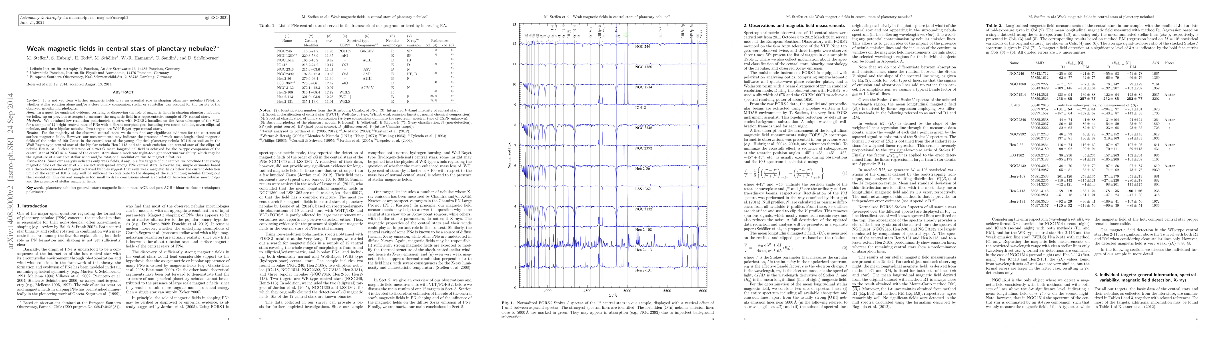 It is not yet clear whether magnetic fields play an essential role in shaping planetary nebulae (PNe), or whether stellar rotation alone and/or a close binary companion can account for the variety of the observed nebular morphologies. In a quest for empirical evidence verifying or disproving the role of magnetic fields in shaping PNe, we follow up on previous attempts to measure the magnetic field in a representative sample of PN central stars. We obtained low-resolution polarimetric spectra with FORS 2 at VLT for a sample of twelve bright central stars of PNe with different morphology, including two round nebulae, seven elliptical nebulae, and three bipolar nebulae. Two targets are Wolf-Rayet type central stars. For the majority of the observed central stars, we do not find any significant evidence for the existence of surface magnetic fields. However, our measurements may indicate the presence of weak mean longitudinal magnetic fields of the order of 100 Gauss in the central star of the young elliptical planetary nebula IC 418, as well as in the Wolf-Rayet type central star of the bipolar nebula Hen2-113 and the weak emission line central star of the elliptical nebula Hen2-131. A clear detection of a 250 G mean longitudinal field is achieved for the A-type companion of the central star of NGC 1514. Some of the central stars show a moderate night-to-night spectrum variability, which may be the signature of a variable stellar wind and/or rotational modulation due to magnetic features. We conclude that strong magnetic fields of the order of kG are not widespread among PNe central stars. Nevertheless, simple estimates based on a theoretical model of magnetized wind bubbles suggest that even weak magnetic fields below the current detection limit of the order of 100 G may well be sufficient to contribute to the shaping of PNe throughout their evolution.
