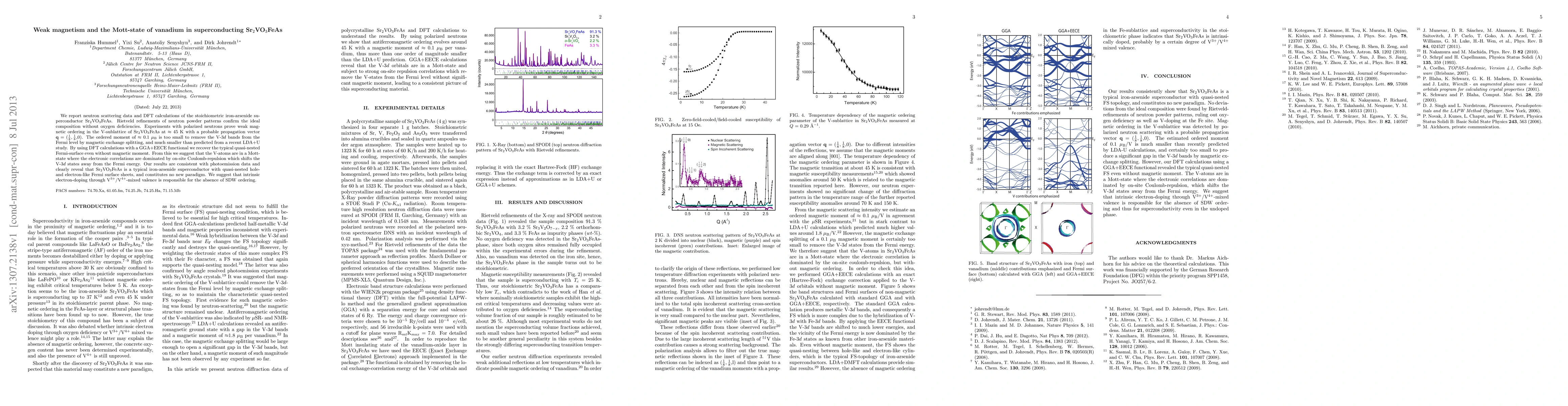 We report neutron scattering data and DFT calculations of the stoichiometric iron-arsenide superconductor Sr2VO3FeAs. Rietveld refinements of neutron powder patterns confirm the ideal composition without oxygen deficiencies. Experiments with polarized neutrons prove weak magnetic ordering in the V-sublattice of Sr2VO3FeAs at ~ 45 K with a probable propagation vector q = (1/8,1/8,0). The ordered moment of ~ 0.1 muB is too small to remove the V-3d bands from the Fermi level by magnetic exchange splitting, and much smaller than predicted from a recent LDA+U study. By using DFT calculations with a GGA+EECE functional we recover the typical quasi-nested Fermi-surface even without magnetic moment. From this we suggest that the V-atoms are in a Mott-state where the electronic correlations are dominated by on-site Coulomb-repulsion which shifts the V-3d states away from the Fermi energy. Our results are consistent with photoemission data and clearly reveal that Sr2VO3FeAs is a typical iron-arsenide superconductor with quasi-nested hole- and electron-like Fermi surface sheets, and constitutes no new paradigm. We suggest that intrinsic electron-doping through V3+/V4+ mixed valence is responsible for the absence of SDW ordering.