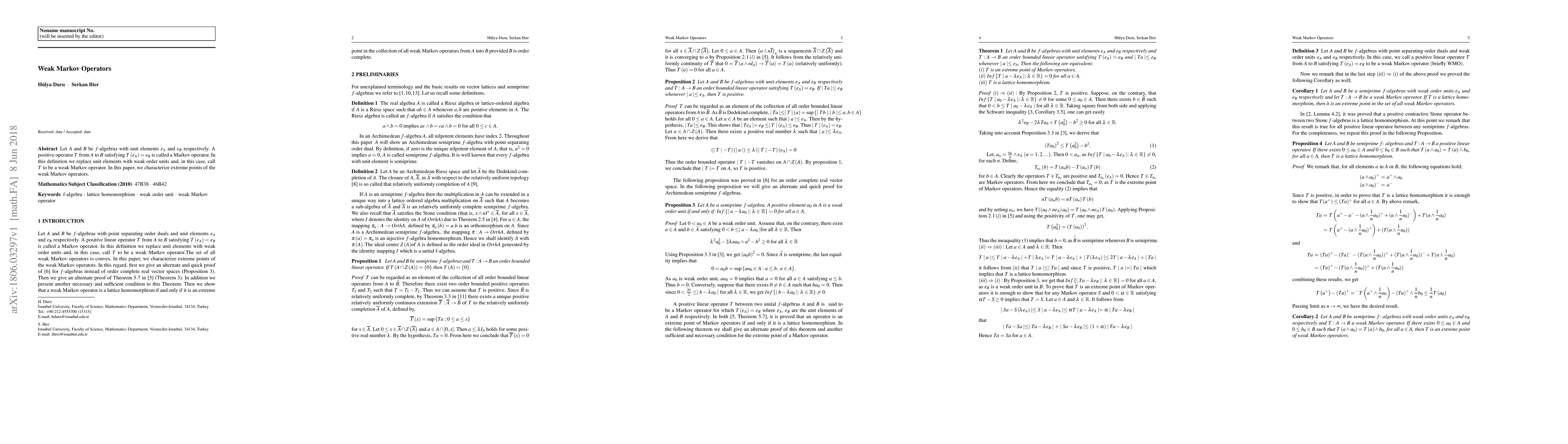 This paper defines weak Markov operators as positive mappings between $f$-algebras that preserve weak order units. It characterizes the extreme points of these operators, providing a deeper understanding of their structure.