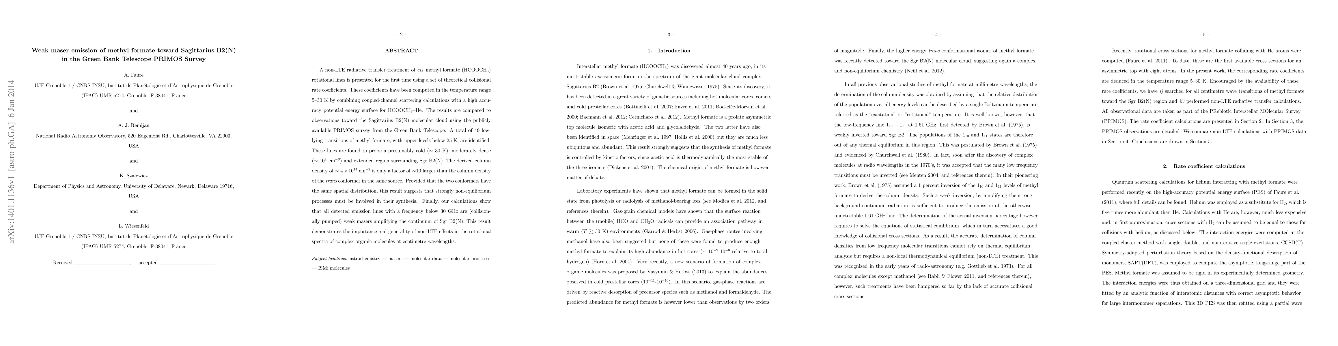 A non-LTE radiative transfer treatment of cis-methyl formate (HCOOCH3) rotational lines is presented for the first time using a set of theoretical collisional rate coefficients. These coefficients have been computed in the temperature range 5-30 K by combining coupled-channel scattering calculations with a high accuracy potential energy surface for HCOOCH3-He. The results are compared to observations toward the Sagittarius B2(N) molecular cloud using the publicly available PRIMOS survey from the Green Bank Telescope. A total of 49 low-lying transitions of methyl formate, with upper levels below 25 K, are identified. These lines are found to probe a presumably cold (~30 K), moderately dense (~1e4 cm-3) and extended region surrounding Sgr B2(N). The derived column density of ~4e14 cm-2 is only a factor of ~10 larger than the column density of the trans conformer in the same source. Provided that the two conformers have the same spatial distribution, this result suggests that strongly non-equilibrium processes must be involved in their synthesis. Finally, our calculations show that all detected emission lines with a frequency below 30 GHz are (collisionally pumped) weak masers amplifying the continuum of Sgr B2(N). This result demonstrates the importance and generality of non-LTE effects in the rotational spectra of complex organic molecules at centimetre wavelengths.