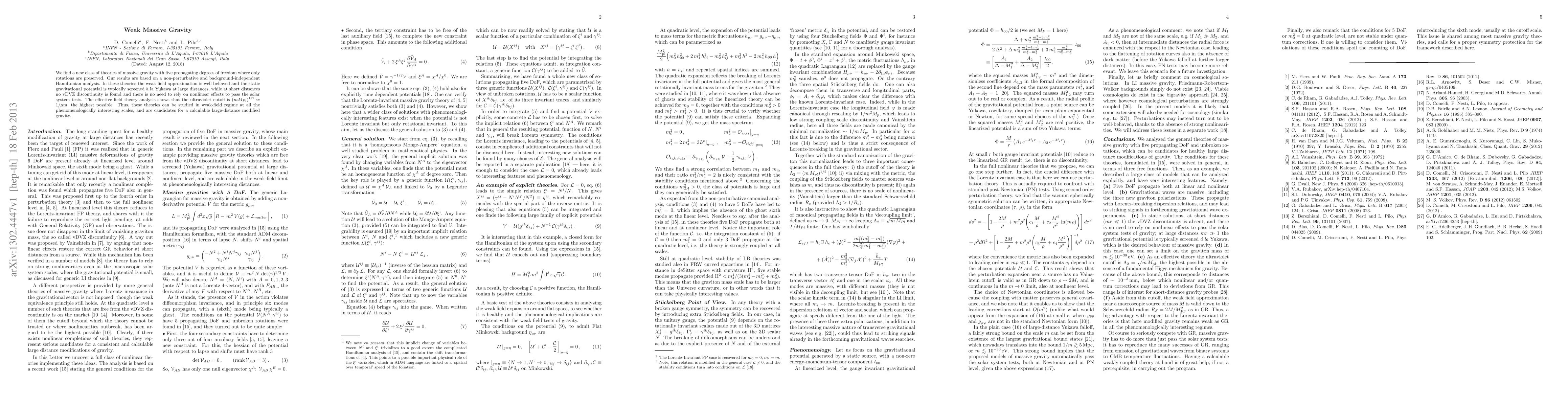 We find a new class of theories of massive gravity with five propagating degrees of freedom where only rotations are preserved. Our results are based on a non-perturbative and background-independent Hamiltonian analysis. In these theories the weak field approximation is well behaved and the static gravitational potential is typically screened \`a la Yukawa at large distances, while at short distances no vDVZ discontinuity is found and there is no need to rely on nonlinear effects to pass the solar system tests. The effective field theory analysis shows that the ultraviolet cutoff is (m M_PL)^1/2 ~ 1/\mu m, the highest possible. Thus, these theories can be studied in weak-field regime at all the phenomenologically interesting scales, and are candidates for a calculable large-distance modified gravity.