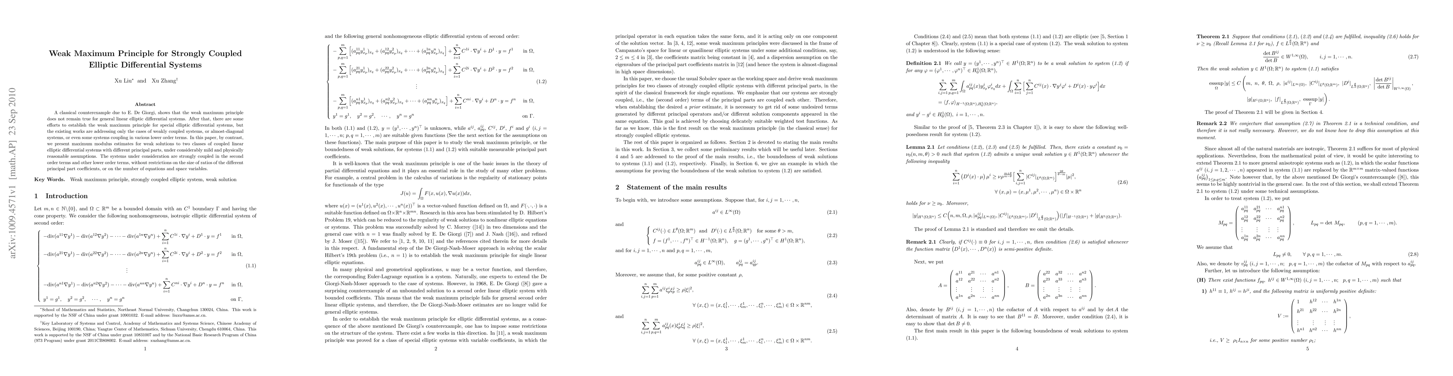 A classical counterexample due to E. De Giorgi, shows that the weak maximum principle does not remain true for general linear elliptic differential systems. After that, there are some efforts to establish the weak maximum principle for special elliptic differential systems, but the existing works are addressing only the cases of weakly coupled systems, or almost-diagonal systems, or even some systems coupling in various lower order terms. In this paper, by contrast, we present maximum modulus estimates for weak solutions to two classes of coupled linear elliptic differential systems with different principal parts, under considerably mild and physically reasonable assumptions. The systems under consideration are strongly coupled in the second order terms and other lower order terms, without restrictions on the size of ratios of the different principal part coefficients, or on the number of equations and space variables.