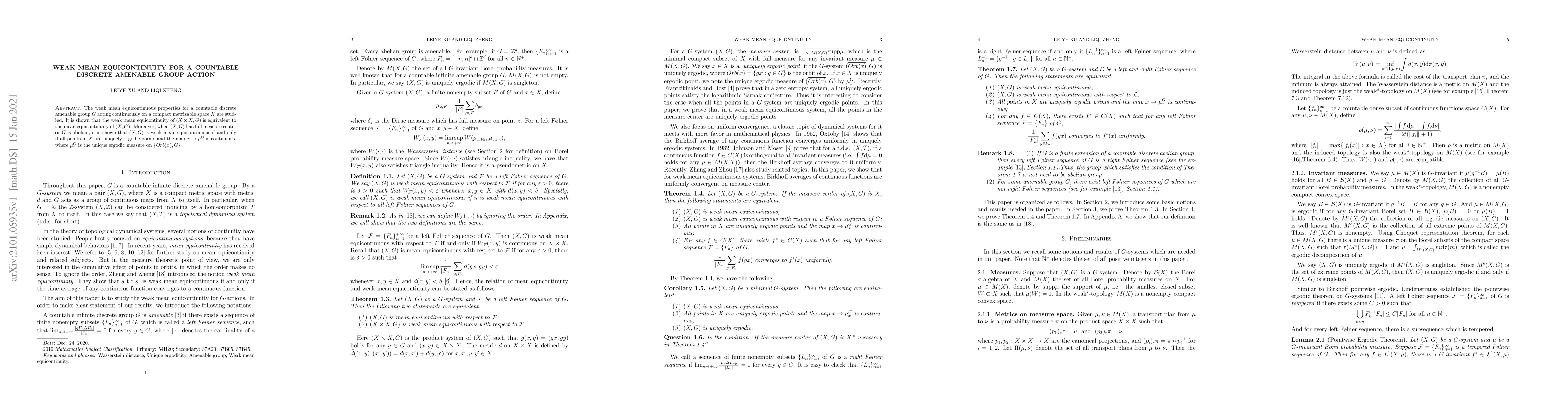 The weak mean equicontinuous properties for a countable discrete amenable group $G$ acting continuously on a compact metrizable space $X$ are studied. It is shown that the weak mean equicontinuity of $(X \times X,G)$ is equivalent to the mean equicontinuity of $(X,G)$. Moreover, when $(X,G)$ has full measure center or $G$ is abelian, it is shown that $(X,G)$ is weak mean equicontinuous if and only if all points in $X$ are uniquely ergodic points and the map $x \to \mu_x^G$ is continuous, where $\mu_x^G$ is the unique ergodic measure on $\{\ol{Orb(x)}, G\}$.