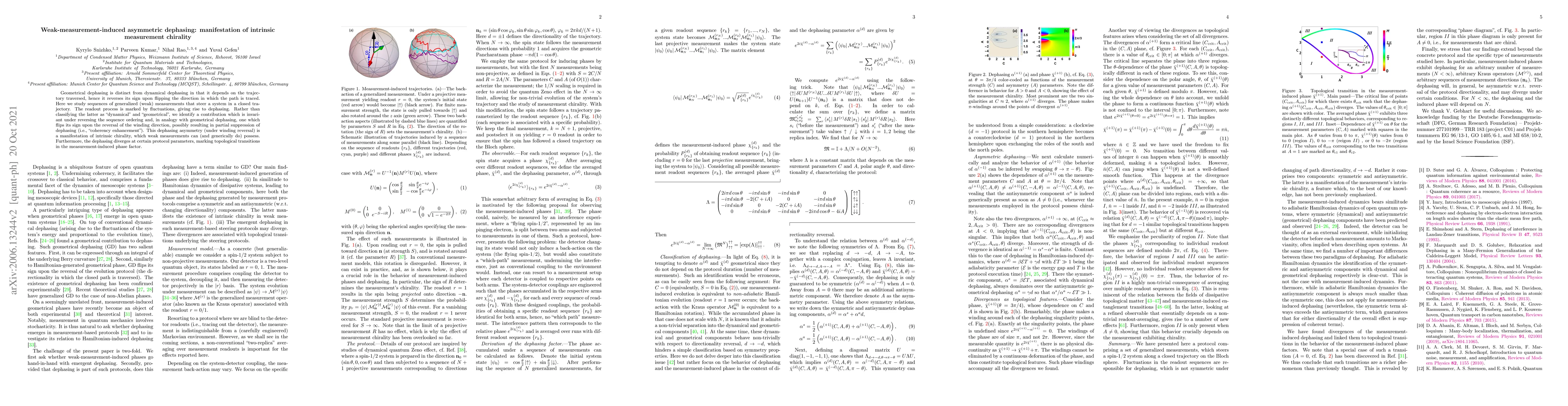 Geometrical dephasing is distinct from dynamical dephasing in that it depends on the trajectory traversed, hence it reverses its sign upon flipping the direction in which the path is traced. Here we study sequences of generalized (weak) measurements that steer a system in a closed trajectory. The readout process is marked by fluctuations, giving rise to dephasing. Rather than classifying the latter as "dynamical" and "geometrical", we identify a contribution which is invariant under reversing the sequence ordering and, in analogy with geometrical dephasing, one which flips its sign upon the reversal of the winding direction, possibly resulting in partial suppression of dephasing (i.e., "coherency enhancement"). This dephasing asymmetry (under winding reversal) is a manifestation of intrinsic chirality, which weak measurements can (and generically do) possess. Furthermore, the dephasing diverges at certain protocol parameters, marking topological transitions in the measurement-induced phase factor.