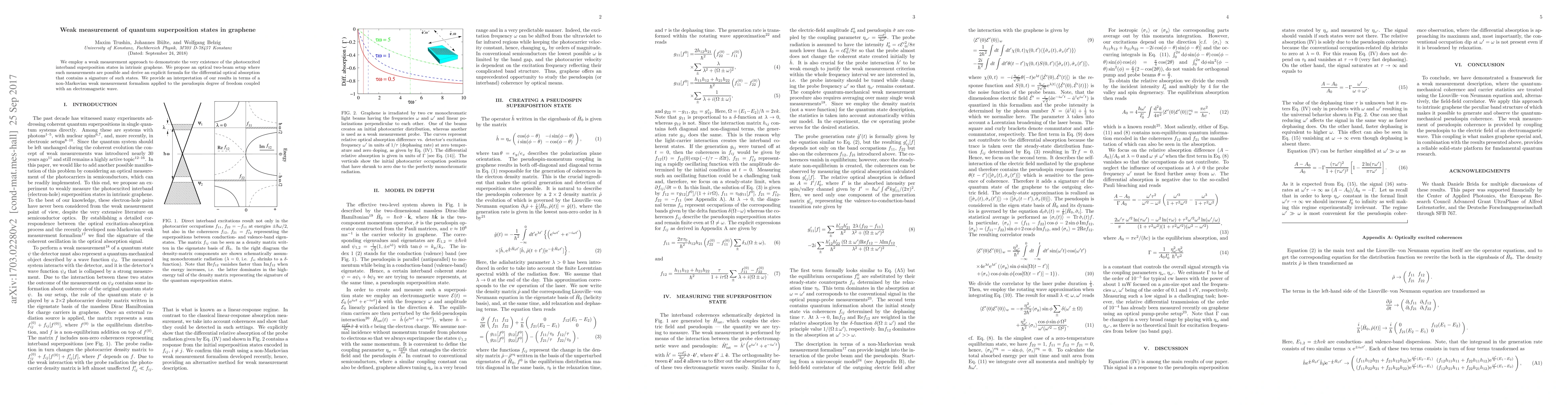 We employ a weak measurement approach to demonstrate the very existence of the photoexcited interband superposition states in intrinsic graphene. We propose an optical two-beam setup where such measurements are possible and derive an explicit formula for the differential optical absorption that contains a signature of such states. We provide an interpretation of our results in terms of a non-Markovian weak measurement formalism applied to the pseudospin degree of freedom coupled with an electromagnetic wave.