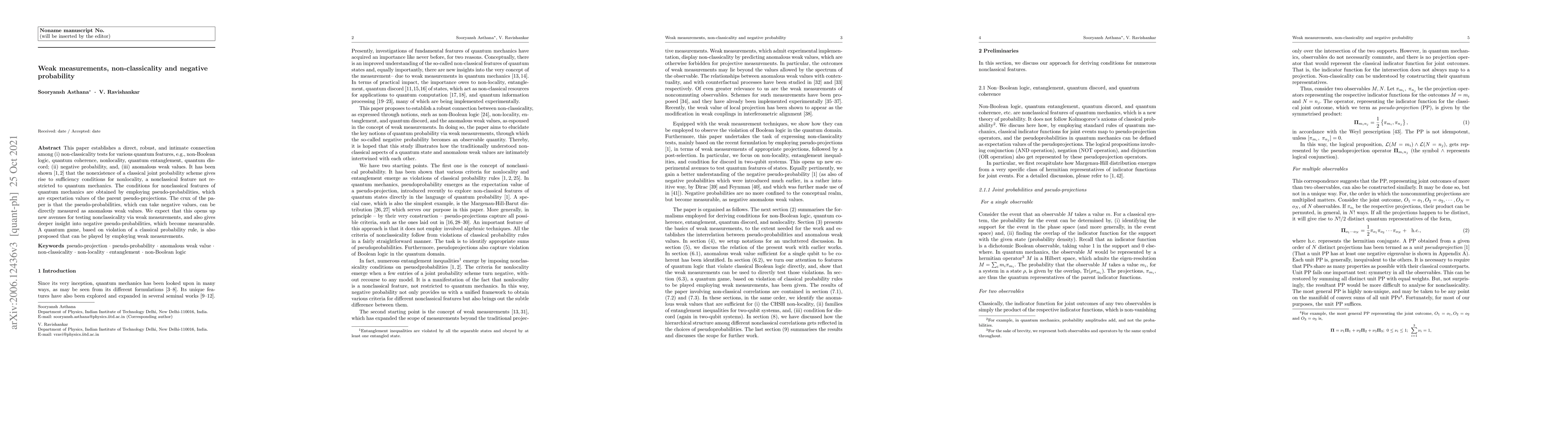 This paper connects non-classicality tests in quantum mechanics, such as nonlocality and entanglement, with negative probability and anomalous weak values, demonstrating that pseudo-probabilities can be directly measured as weak values, thereby offering new methods for testing nonclassical features. A quantum game is also proposed to illustrate the practical application of these principles.