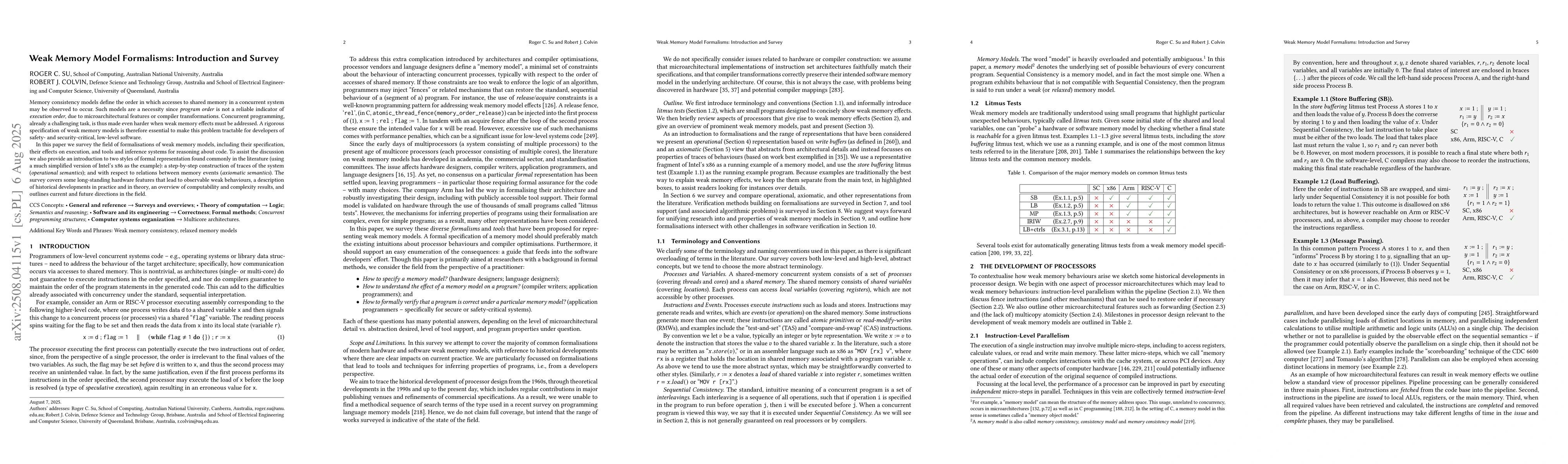 Memory consistency models define the order in which accesses to shared memory in a concurrent system may be observed to occur. Such models are a necessity since program order is not a reliable indicator of execution order, due to microarchitectural features or compiler transformations. Concurrent programming, already a challenging task, is thus made even harder when weak memory effects must be addressed. A rigorous specification of weak memory models is therefore essential to make this problem tractable for developers of safety- and security-critical, low-level software. In this paper we survey the field of formalisations of weak memory models, including their specification, their effects on execution, and tools and inference systems for reasoning about code. To assist the discussion we also provide an introduction to two styles of formal representation found commonly in the literature (using a much simplified version of Intel's x86 as the example): a step-by-step construction of traces of the system (operational semantics); and with respect to relations between memory events (axiomatic semantics). The survey covers some long-standing hardware features that lead to observable weak behaviours, a description of historical developments in practice and in theory, an overview of computability and complexity results, and outlines current and future directions in the field.
