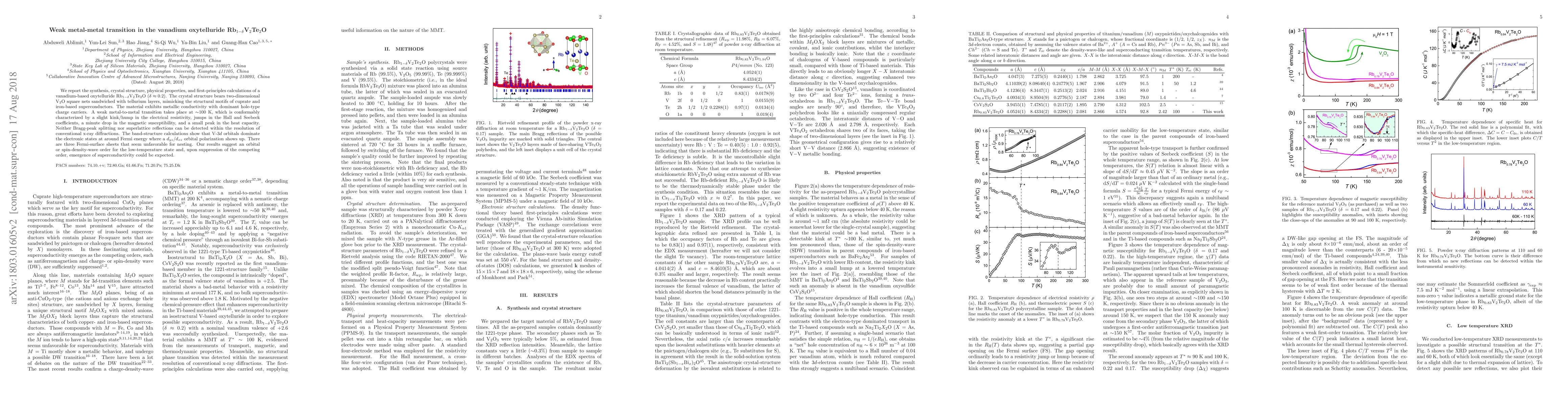We report the synthesis, crystal structure, physical properties, and first-principles calculations of a vanadium-based oxytelluride Rb$_{1-\delta}$V$_2$Te$_2$O ($\delta\approx0.2$). The crystal structure bears two-dimensional V$_2$O square nets sandwiched with tellurium layers, mimicking the structural motifs of cuprate and iron-based superconductors. The material exhibits metallic conductivity with dominant hole-type charge carriers. A weak metal-to-metal transition takes place at $\sim$100 K, which is conformably characterized by a slight kink/hump in the electrical resistivity, jumps in the Hall and Seebeck coefficients, a minute drop in the magnetic susceptibility, and a small peak in the heat capacity. Neither Bragg-peak splitting nor superlattice reflections can be detected within the resolution of conventional x-ray diffractions. The band-structure calculations show that V-3$d$ orbitals dominate the electronic states at around Fermi energy where a $d_{yz}/d_{xz}$ orbital polarization shows up. There are three Fermi-surface sheets that seem unfavorable for nesting. Our results suggest an orbital or spin-density-wave order for the low-temperature state and, upon suppression of the competing order, emergence of superconductivity could be expected.