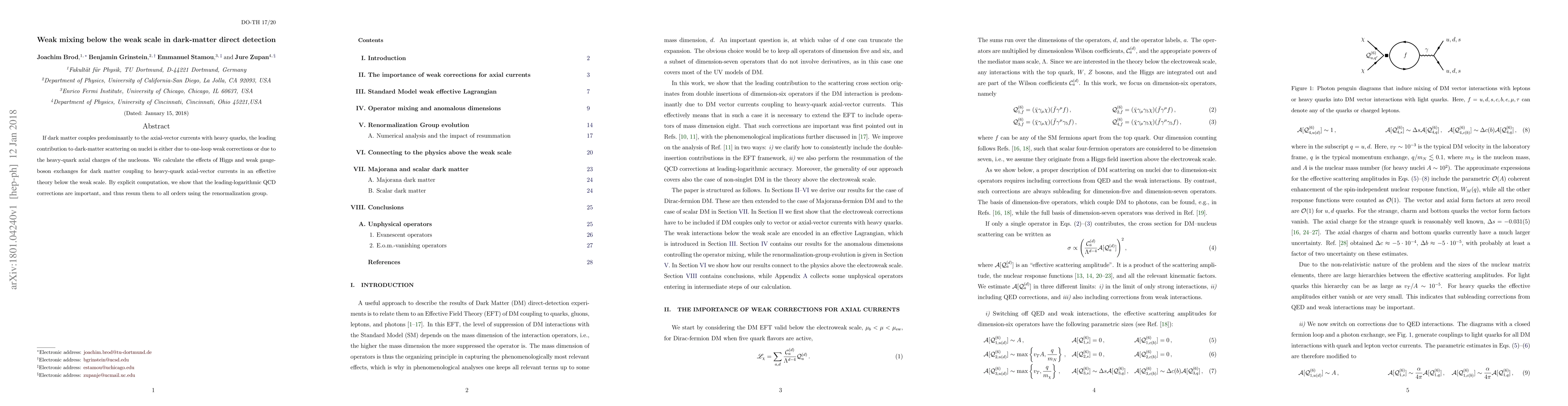 If dark matter couples predominantly to the axial-vector currents with heavy quarks, the leading contribution to dark-matter scattering on nuclei is either due to one-loop weak corrections or due to the heavy-quark axial charges of the nucleons. We calculate the effects of Higgs and weak gauge-boson exchanges for dark matter coupling to heavy-quark axial-vector currents in an effective theory below the weak scale. By explicit computation, we show that the leading-logarithmic QCD corrections are important, and thus resum them to all orders using the renormalization group.