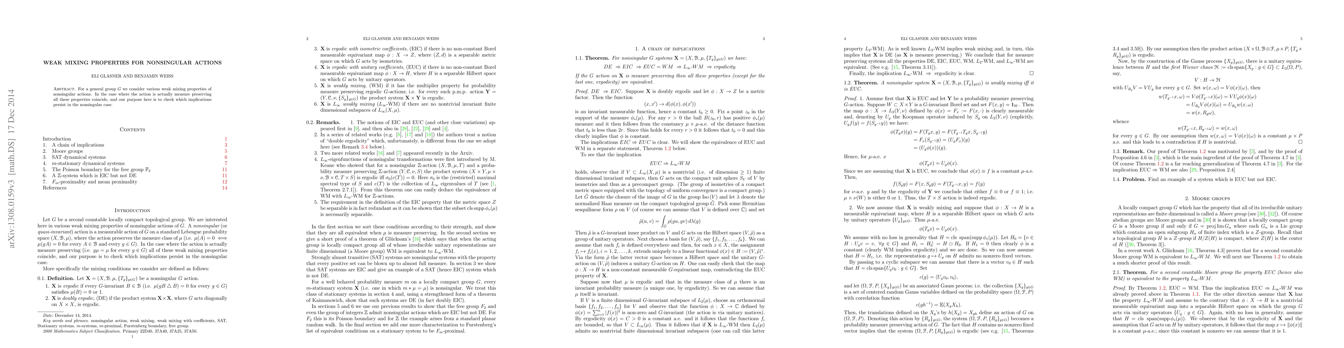 For a general group G we consider various weak mixing properties of nonsingular actions. In the case where the action is actually measure preserving all these properties coincide, and our purpose here is to check which implications persist in the nonsingular case.