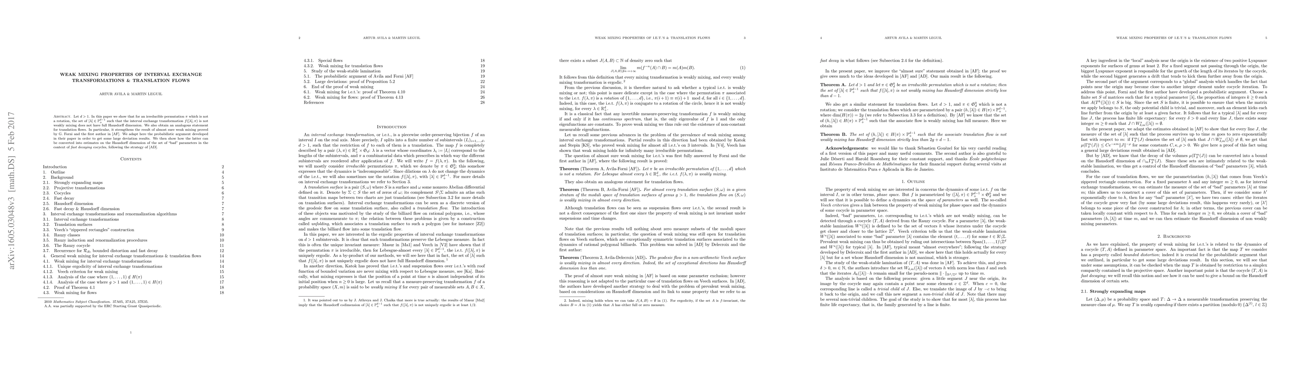 Let $d >1$. In this paper we show that for an irreducible permutation $\pi$ which is not a rotation, the set of $[\lambda]\in \mathbb{P}_+^{d-1}$ such that the interval exchange transformation $f([\lambda],\pi)$ is not weakly mixing does not have full Hausdorff dimension. We also obtain an analogous statement for translation flows. In particular, it strengthens the result of almost sure weak mixing proved by G. Forni and the first author. We adapt here the probabilistic argument developed in their paper in order to get some large deviation results. We then show how the latter can be converted into estimates on the Hausdorff dimension of the set of "bad" parameters in the context of fast decaying cocycles, following a strategy developed by V. Delecroix and the first author.