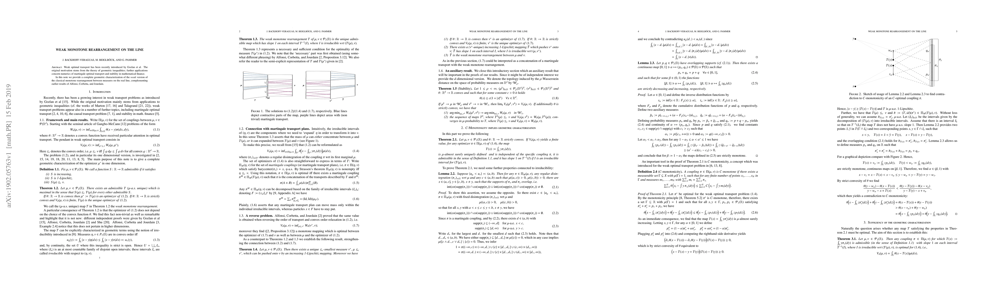 This paper offers a comprehensive geometric characterization of the 'weak' version of the classical monotone rearrangement for measures on the real line, extending prior work by Alfonsi, Corbetta, and Jourdain. It builds on the concept of weak optimal transport introduced by Gozlan et al. and has implications for geometric inequalities and mathematical finance.