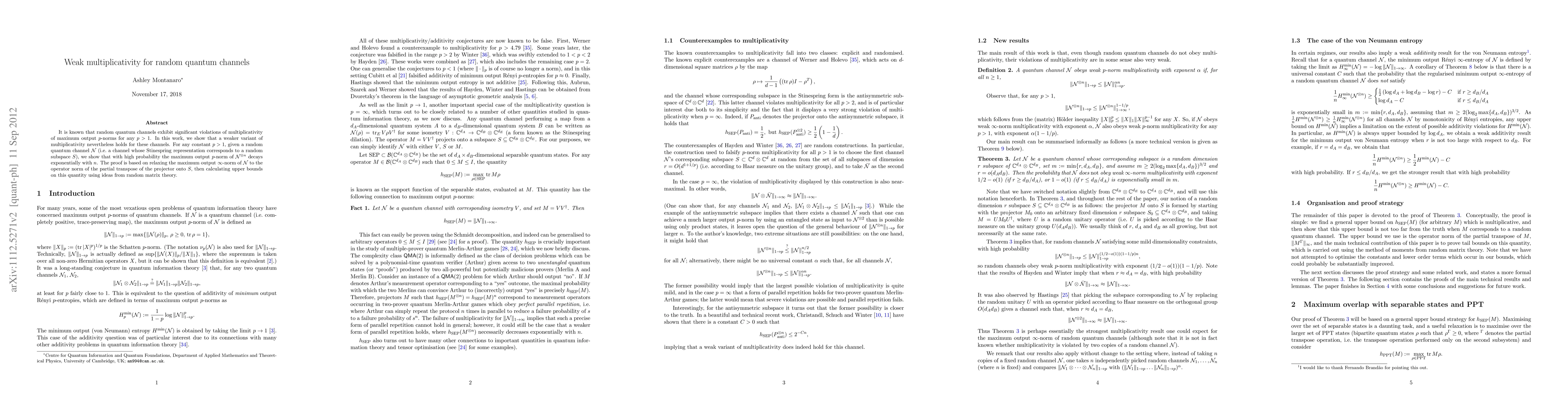 This paper demonstrates that while random quantum channels violate strong multiplicativity, a weaker form holds: the maximum output p-norm of n copies of such a channel decays exponentially with n. The proof leverages random matrix theory to analyze the operator norm of the partial transpose of the projector onto the random subspace.