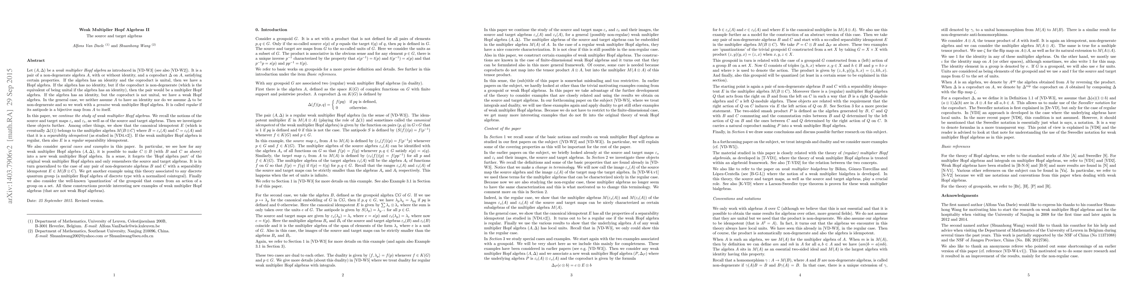 This paper continues the study of weak multiplier Hopf algebras, focusing on the source and target algebras and their associated maps. It demonstrates that the canonical idempotent belongs to the multiplier algebra of the tensor product of these algebras and serves as a separability idempotent, highlighting special cases and providing new examples of weak multiplier Hopf algebras derived from quantum groups and groupoid actions.