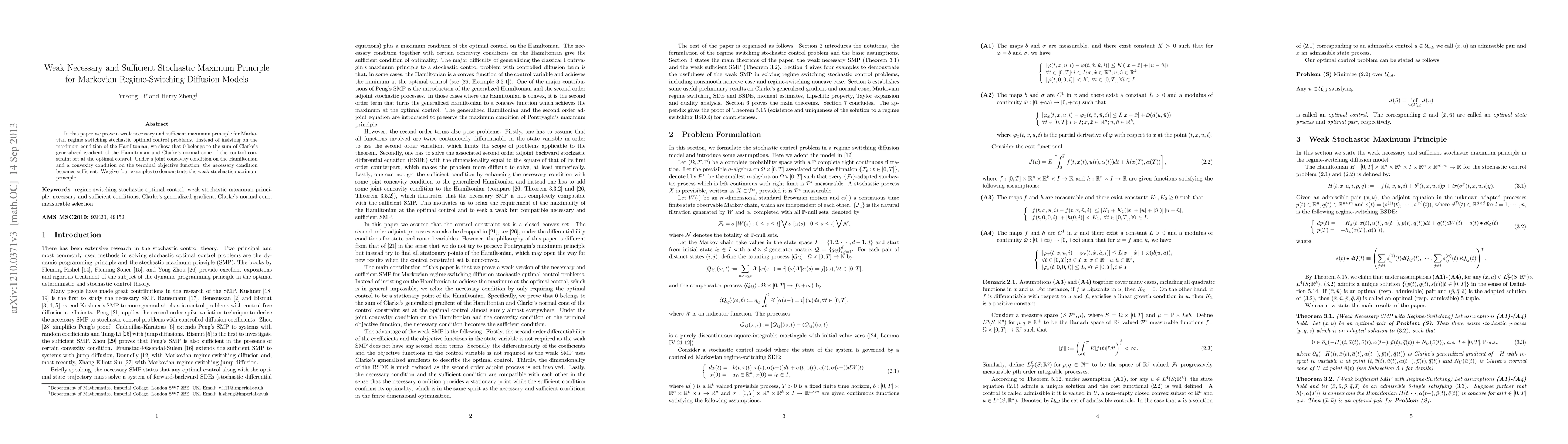 In this paper we prove a weak necessary and sufficient maximum principle for Markovian regime switching stochastic optimal control problems. Instead of insisting on the maximum condition of the Hamiltonian, we show that 0 belongs to the sum of Clarke's generalized gradient of the Hamiltonian and Clarke's normal cone of the control constraint set at the optimal control. Under a joint concavity condition on the Hamiltonian and a convexity condition on the terminal objective function, the necessary condition becomes sufficient. We give four examples to demonstrate the weak stochastic maximum principle.