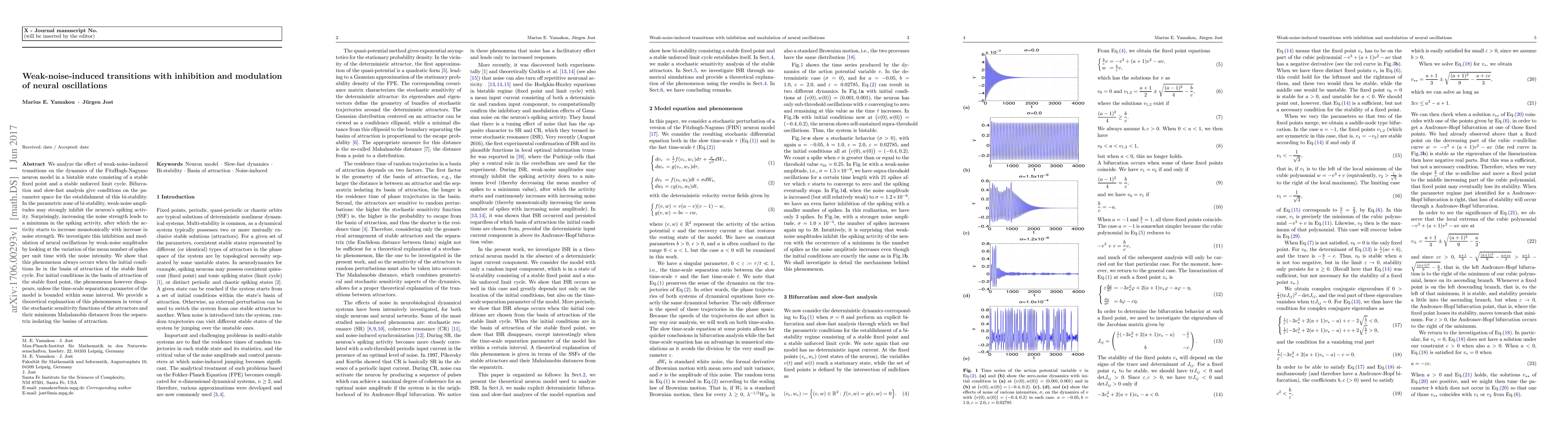 We analyze the effect of weak-noise-induced transitions on the dynamics of the FitzHugh-Nagumo neuron model in a bistable state consisting of a stable fixed point and a stable unforced limit cycle. Bifurcation and slow-fast analysis give conditions on the parameter space for the establishment of this bi-stability. In the parametric zone of bi-stability, weak-noise amplitudes may strongly inhibit the neuron's spiking activity. Surprisingly, increasing the noise strength leads to a minimum in the spiking activity, after which the activity starts to increase monotonically with increase in noise strength. We investigate this inhibition and modulation of neural oscillations by weak-noise amplitudes by looking at the variation of the mean number of spikes per unit time with the noise intensity. We show that this phenomenon always occurs when the initial conditions lie in the basin of attraction of the stable limit cycle. For initial conditions in the basin of attraction of the stable fixed point, the phenomenon however disappears, unless the time-scale separation parameter of the model is bounded within some interval. We provide a theoretical explanation of this phenomenon in terms of the stochastic sensitivity functions of the attractors and their minimum Mahalanobis distances from the separatrix isolating the basins of attraction.
