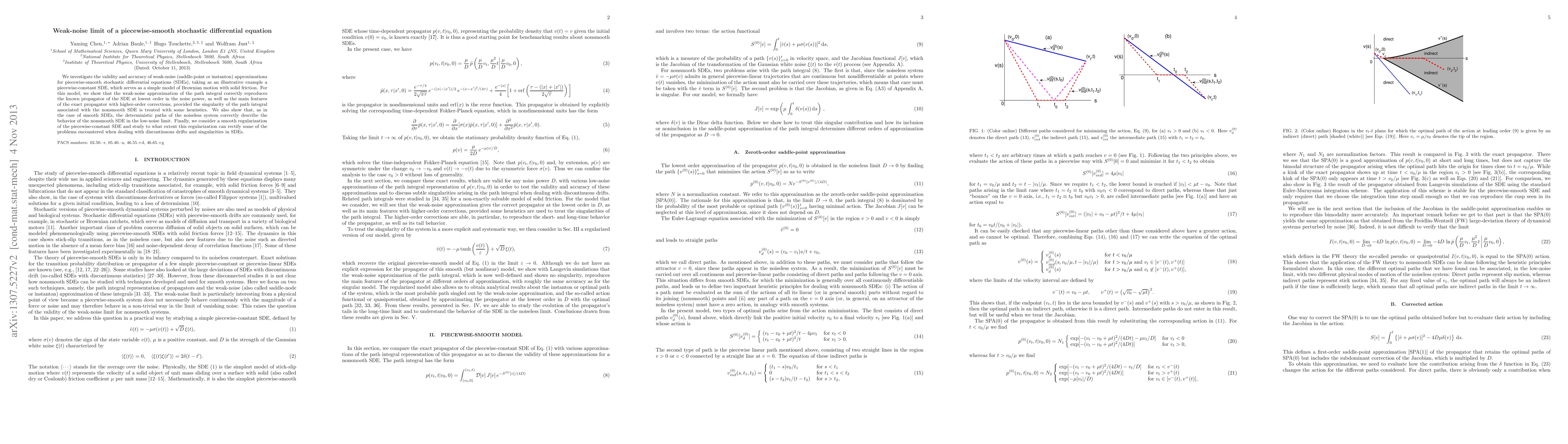 We investigate the validity and accuracy of weak-noise (saddle-point or instanton) approximations for piecewise-smooth stochastic differential equations (SDEs), taking as an illustrative example a piecewise-constant SDE, which serves as a simple model of Brownian motion with solid friction. For this model, we show that the weak-noise approximation of the path integral correctly reproduces the known propagator of the SDE at lowest order in the noise power, as well as the main features of the exact propagator with higher-order corrections, provided that the singularity of the path integral associated with the non-smooth SDE is treated with some heuristics. We also show that, as in the case of smooth SDEs, the deterministic paths of the noiseless system correctly describe the behaviour of the non-smooth SDE in the low-noise limit. Finally, we consider a smooth regularisation of the piecewise-constant SDE and study to which extent this regularisation can rectify some of the problems encountered when dealing with discontinuous drifts and singularities in SDEs.