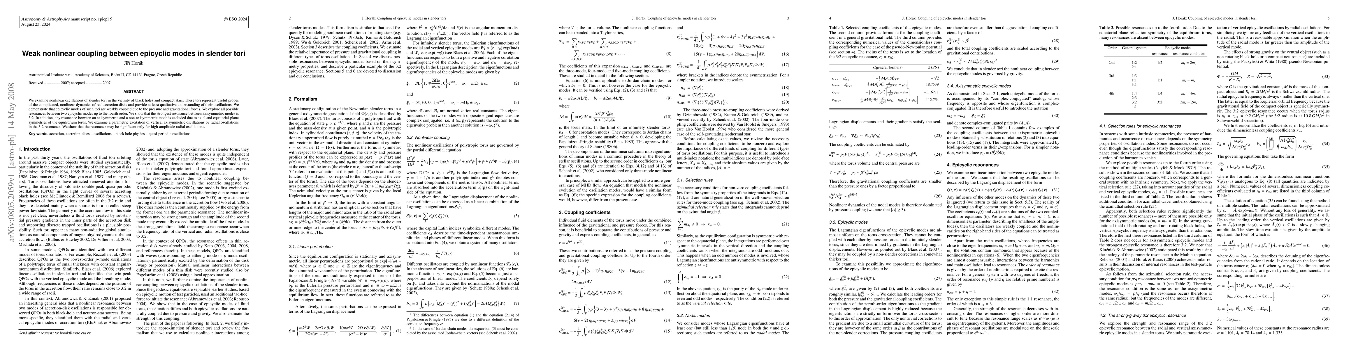 This paper investigates the nonlinear coupling of epicyclic modes in slender tori near black holes and compact stars, revealing weak coupling due to pressure and gravitational forces. It identifies the strongest resonance as 3:2 between axisymmetric modes and excludes resonances between axisymmetric and non-axisymmetric modes due to symmetry.