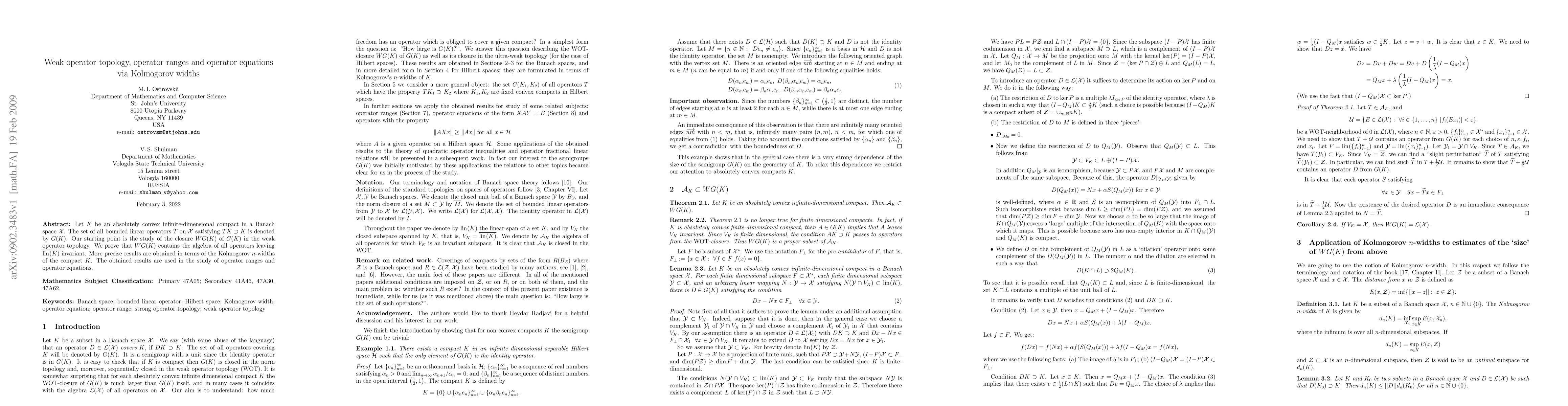 This research paper explores the relationship between weak operator topology, Kolmogorov widths, and operator equations in a Banach space, providing insights into operator ranges and invariant subspaces.