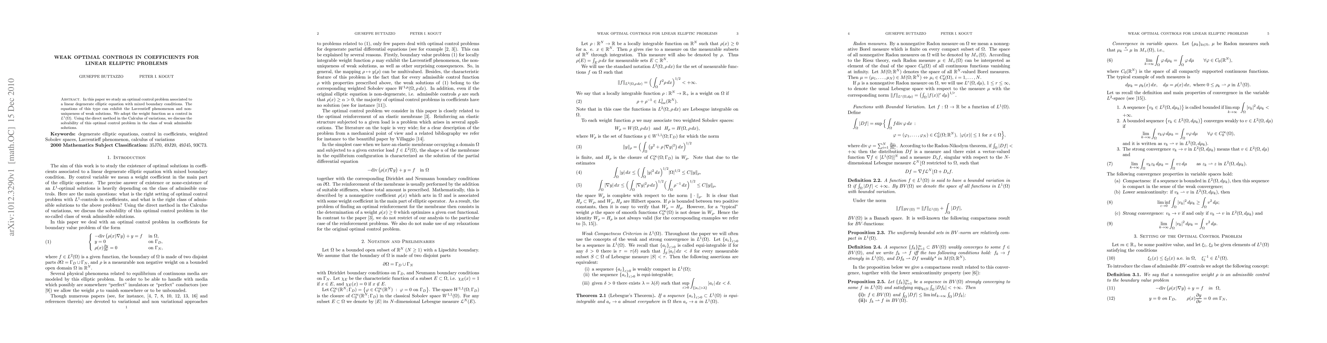 In this paper we study an optimal control problem associated to a linear degenerate elliptic equation with mixed boundary conditions. The equations of this type can exhibit the Lavrentieff phenomenon and non-uniqueness of weak solutions. We adopt the weight function as a control in $L^1(\Omega)$. Using the direct method in the Calculus of variations, we discuss the solvability of this optimal control problem in the class of weak admissible solutions.