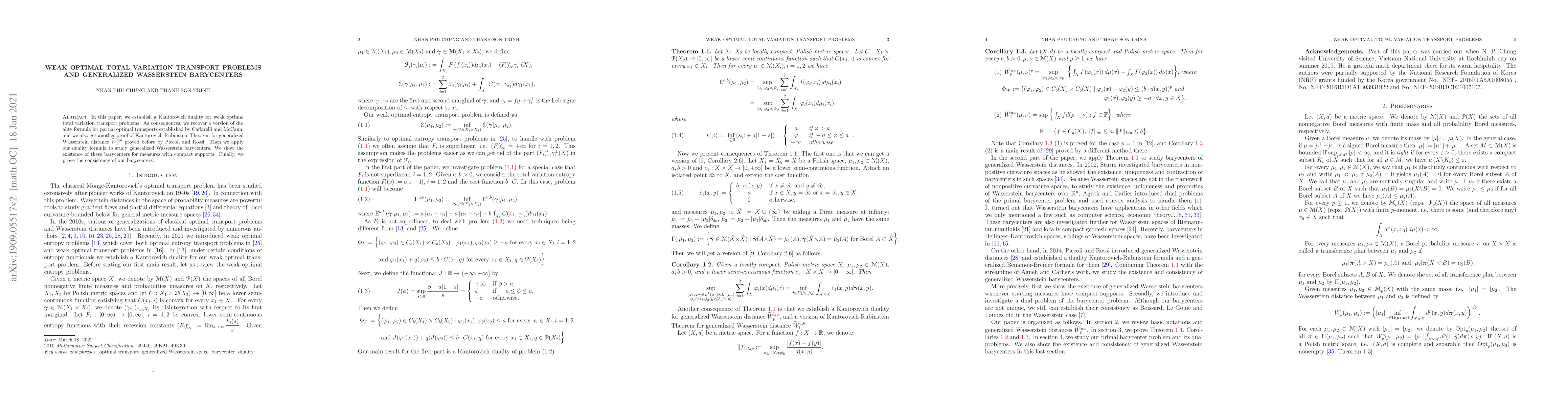 This paper establishes a Kantorovich duality for weak optimal total variation transport problems, leading to a version of duality for partial optimal transports and a new proof of the Kantorovich-Rubinstein Theorem for generalized Wasserstein distances. It also explores the existence and consistency of generalized Wasserstein barycenters for measures with compact supports.