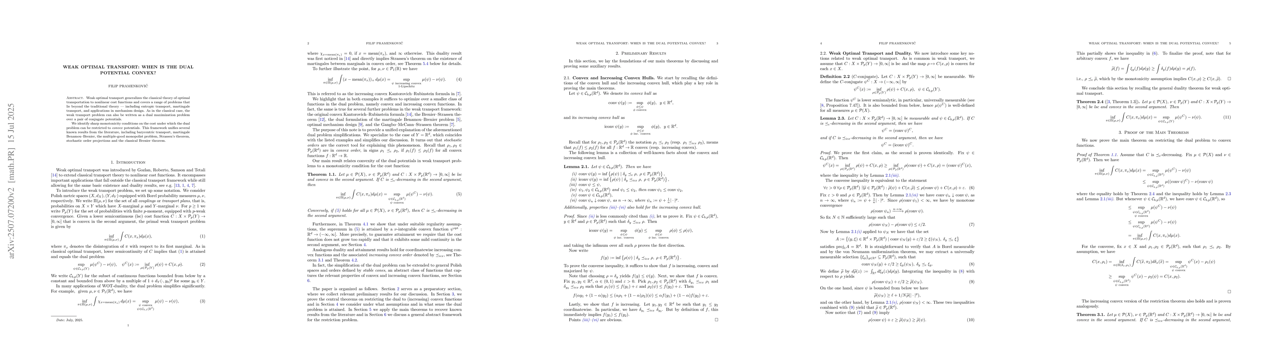 Weak optimal transport generalizes the classical theory of optimal transportation to nonlinear cost functions and covers a range of problems that lie beyond the traditional theory - including entropic transport, martingale transport, and applications in mechanism design. As in the classical case, the weak transport problem can also be written as a dual maximization problem over a pair of conjugate potentials. We identify sharp monotonicity conditions on the cost under which the dual problem can be restricted to convex potentials. This framework unifies several known results from the literature, including barycentric transport, martingale Benamou-Brenier, the multiple-good monopolist problem, Strassen's theorem, stochastic order projections and the classical Brenier theorem.