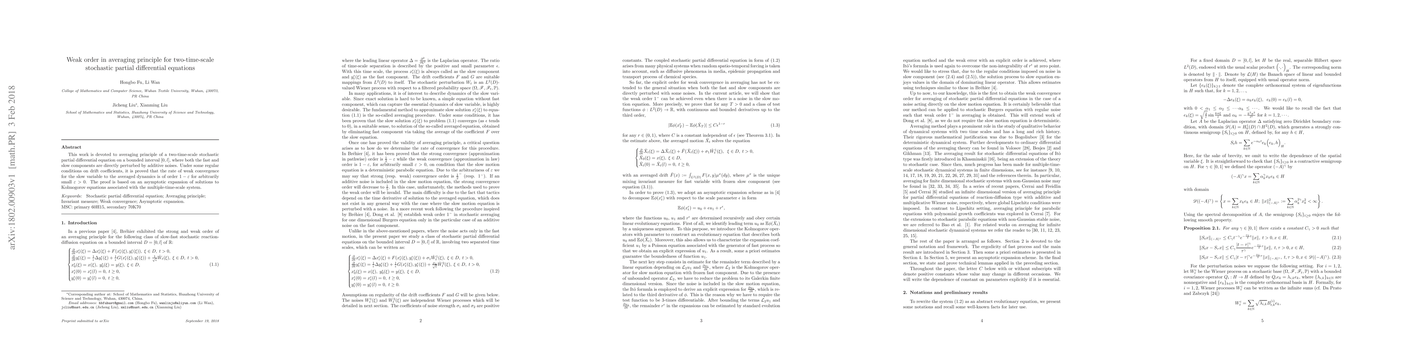 This work is devoted to averaging principle of a two-time-scale stochastic partial differential equation on a bounded interval $[0, l]$, where both the fast and slow components are directly perturbed by additive noises. Under some regular conditions on drift coefficients, it is proved that the rate of weak convergence for the slow variable to the averaged dynamics is of order $1-\varepsilon$ for arbitrarily small $\varepsilon>0$. The proof is based on an asymptotic expansion of solutions to Kolmogorov equations associated with the multiple-time-scale system.