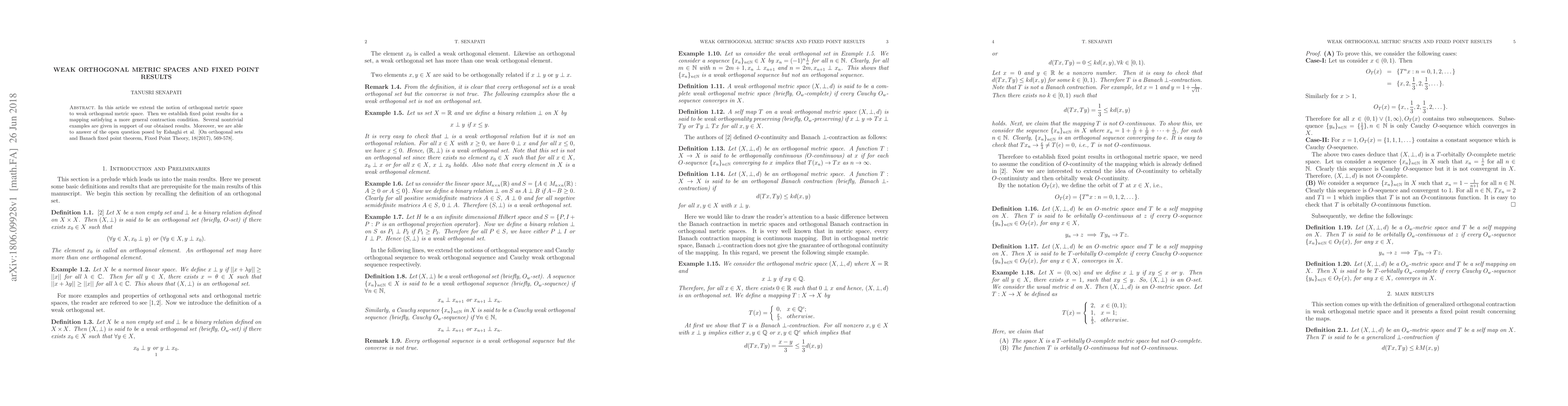 In this article we extend the notion of orthogonal metric space to weak orthogonal metric space. Then we establish fixed point results for a mapping satisfying a more general contraction condition. Several nontrivial examples are given in support of our obtained results. Moreover, we are able to answer of the open question posed by Eshaghi et al. [On orthogonal sets and Banach fixed point theorem, Fixed Point Theory, 18(2017), 569-578].