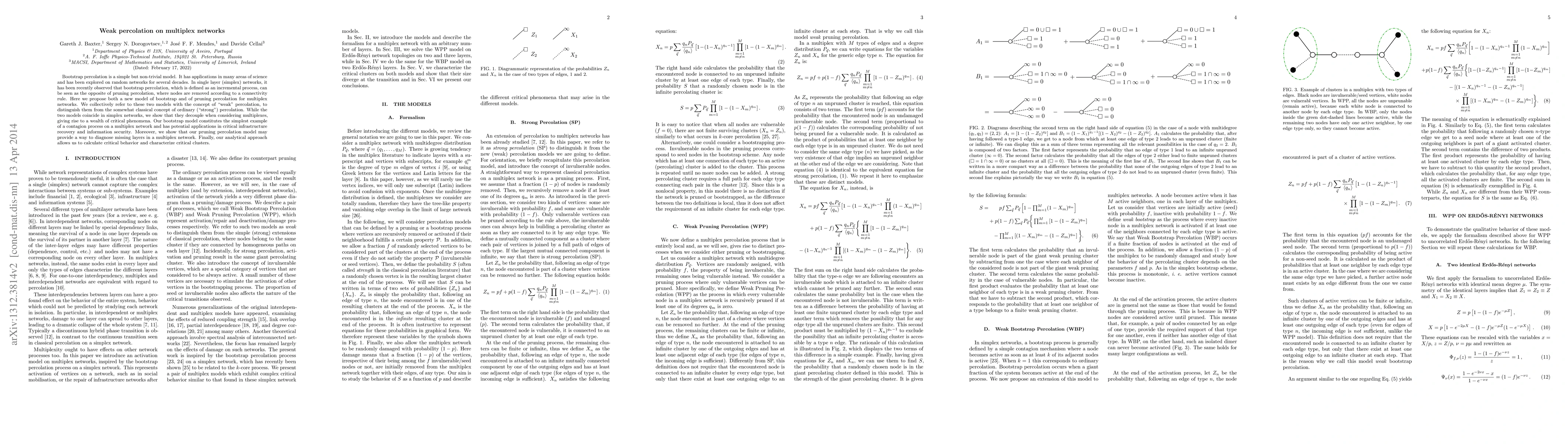 This paper explores two models of "weak" percolation—bootstrap and pruning—on multiplex networks, distinguishing them from traditional "strong" percolation. It reveals that while these models coincide in simplex networks, they diverge in multiplexes, leading to unique critical phenomena and potential applications in infrastructure recovery and information security.