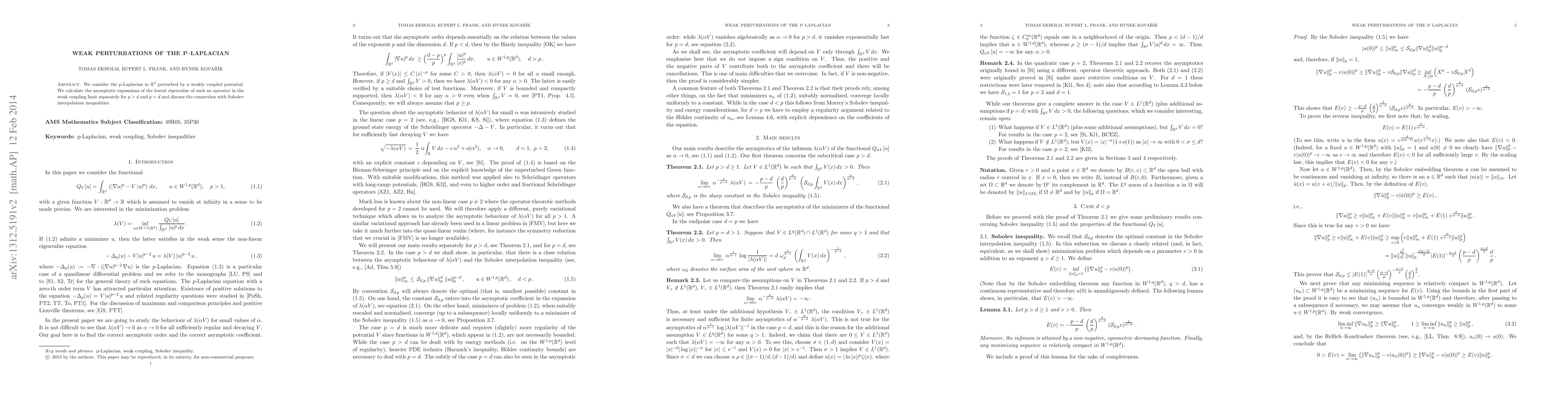 We consider the p-Laplacian in R^d perturbed by a weakly coupled potential. We calculate the asymptotic expansions of the lowest eigenvalue of such an operator in the weak coupling limit separately for p>d and p=d and discuss the connection with Sobolev interpolation inequalities.