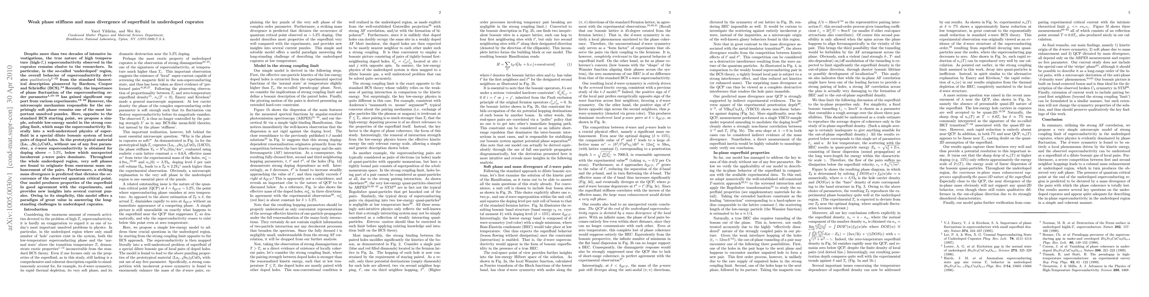 Despite more than two decades of intensive investigations, the true nature of high temperature (high-$T_c$) superconductivity observed in the cuprates remains elusive to the researchers. In particular, in the so-called `underdoped' region, the overall behavior of superconductivity deviates $qualitatively$ from the standard theoretical description pioneered by Bardeen, Cooper and Schrieffer (BCS). Recently, the importance of phase fluctuation of the superconducting order parameter has gained significant support from various experiments. However, the microscopic mechanism responsible for the surprisingly soft phase remains one of the most important unsolved puzzles. Here, opposite to the standard BCS starting point, we propose a simple, solvable low-energy model in the strong coupling limit, which maps the superconductivity literally into a well-understood physics of superfluid in a special dilute bosonic system of local pairs of doped holes. In the prototypical material (La$_{1-\delta}$Sr$_\delta$)$_2$CuO$_4$, without use of any free parameter, a $d$-wave superconductivity is obtained for doping above $\sim 5.2\%$, below which unexpected incoherent $p$-wave pairs dominate. Throughout the whole underdoped region, very soft phases are found to originate from enormous mass enhancement of the pairs. Furthermore, a striking mass divergence is predicted that dictates the occurrence of the observed quantum critical point. Our model produces properties of the superfluid in good agreement with the experiments, and provides new insights into several current puzzles. Owing to its simplicity, this model offers a paradigm of great value in answering the long-standing challenges in underdoped cuprates.