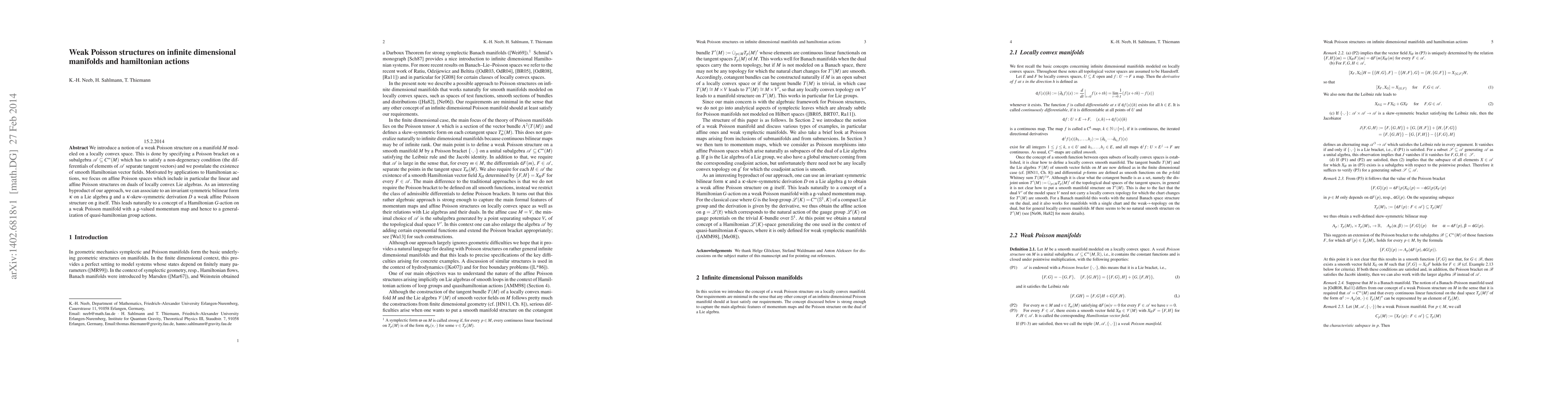 This paper introduces a weak Poisson structure on infinite-dimensional manifolds modeled on locally convex spaces, focusing on subalgebras that satisfy a non-degeneracy condition. It explores Hamiltonian actions and affine Poisson spaces, leading to a generalization of quasi-hamiltonian group actions through the association of weak affine Poisson structures to invariant bilinear forms and derivations on Lie algebras.