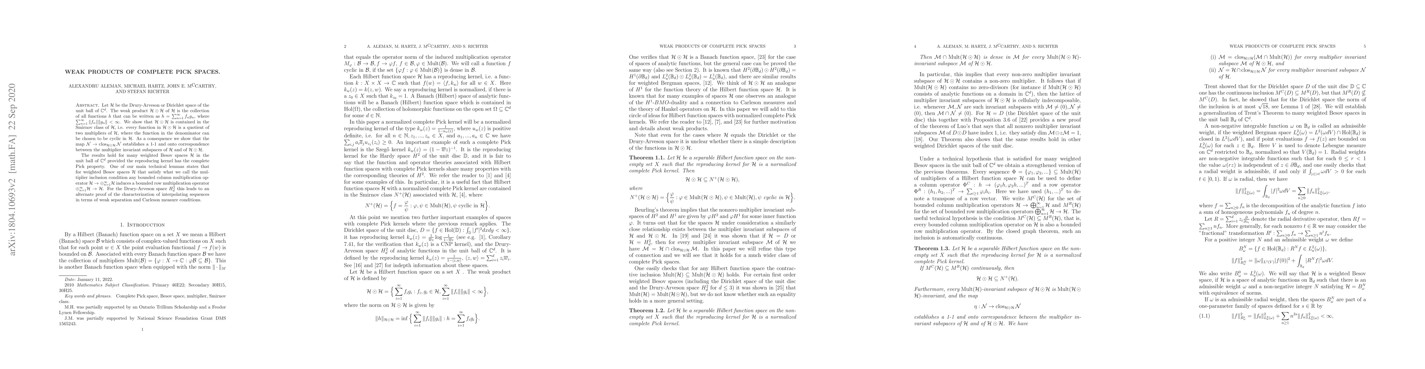 Let $\mathcal H$ be the Drury-Arveson or Dirichlet space of the unit ball of $\mathbb C^d$. The weak product $\mathcal H\odot\mathcal H$ of $\mathcal H$ is the collection of all functions $h$ that can be written as $h=\sum_{n=1}^\infty f_n g_n$, where $\sum_{n=1}^\infty \|f_n\|\|g_n\|<\infty$. We show that $\mathcal H\odot\mathcal H$ is contained in the Smirnov class of $\mathcal H$, i.e. every function in $\mathcal H\odot\mathcal H$ is a quotient of two multipliers of $\mathcal H$, where the function in the denominator can be chosen to be cyclic in $\mathcal H$. As a consequence we show that the map $\mathcal N \to clos_{\mathcal H\odot\mathcal H} \mathcal N$ establishes a 1-1 and onto correspondence between the multiplier invariant subspaces of $\mathcal H$ and of $\mathcal H\odot\mathcal H$. The results hold for many weighted Besov spaces $\mathcal H$ in the unit ball of $\mathbb C^d$ provided the reproducing kernel has the complete Pick property. One of our main technical lemmas states that for weighted Besov spaces $\mathcal H$ that satisfy what we call the multiplier inclusion condition any bounded column multiplication operator $\mathcal H \to \oplus_{n=1}^\infty \mathcal H$ induces a bounded row multiplication operator $\oplus_{n=1}^\infty \mathcal H \to \mathcal H$. For the Drury-Arveson space $H^2_d$ this leads to an alternate proof of the characterization of interpolating sequences in terms of weak separation and Carleson measure conditions.