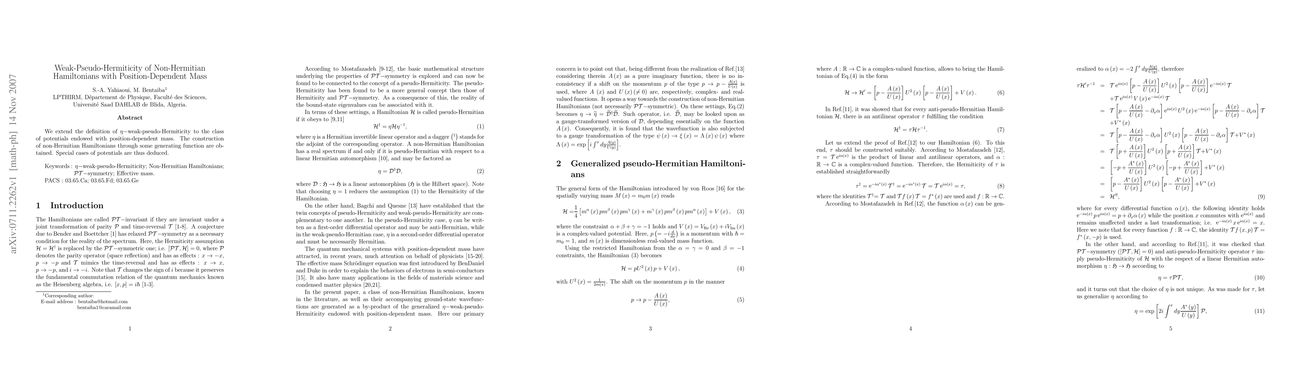 This paper extends the concept of eta-weak-pseudo-Hermiticity to non-Hermitian Hamiltonians featuring position-dependent mass. It also constructs these Hamiltonians via generating functions and explores specific potential cases.