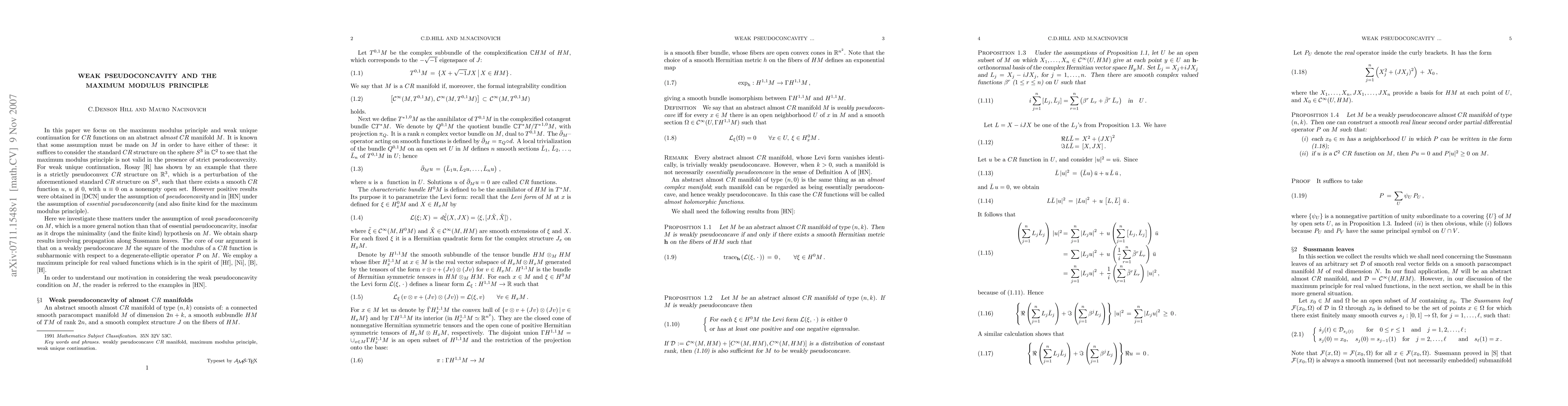 This paper explores the maximum modulus principle and weak unique continuation for CR functions on an abstract almost CR manifold under the assumption of weak pseudoconcavity, achieving sharp results on propagation along Sussmann leaves.